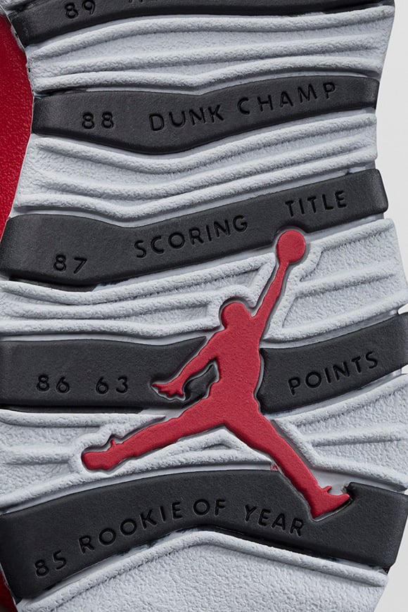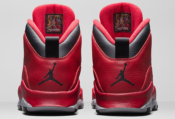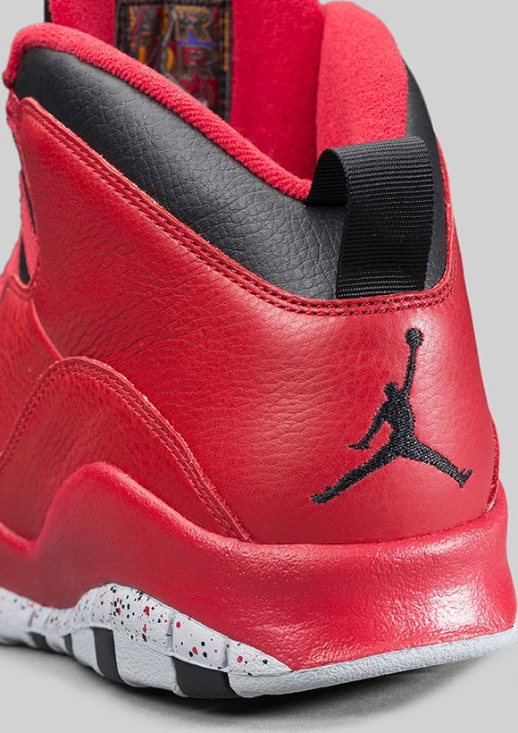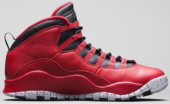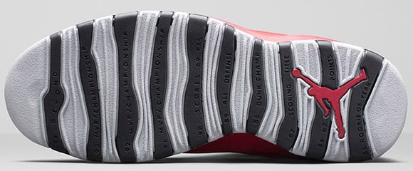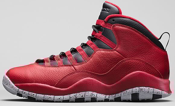 As you can see, gym red makes up most of the Air Jordan 10 which will be a hit amongst sneakerheads. Minimal use of black is used around the collar, tongue, sole, eyelets and heel. Finally the outsole is wrapped with wolf grey and cement print finish which represents the courts of NYC.