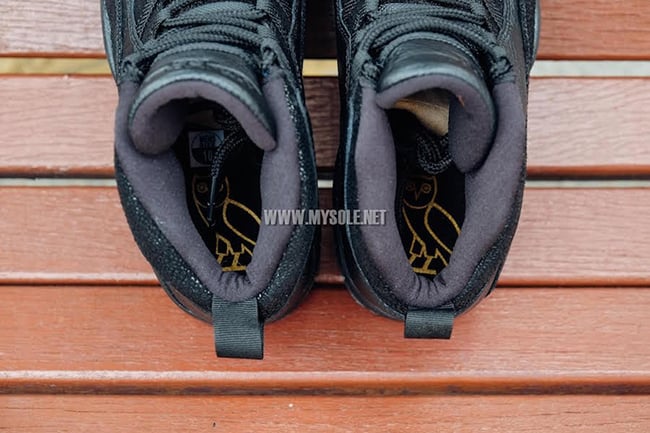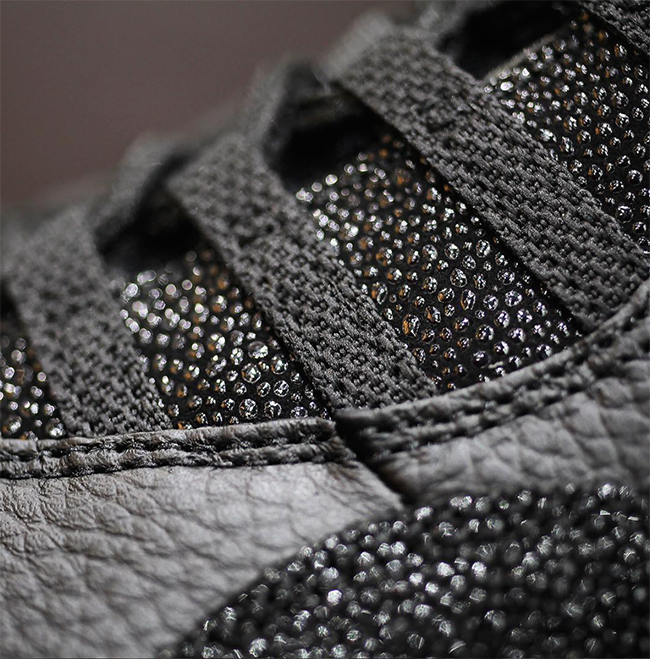 Featuring a predominate black upper with stingray leather running through the sides and a grain texture on the mudguard, eyelets and around the collar. Metallic gold hits the OVO Owl on the insole while a dark milky outsole finishes the look.