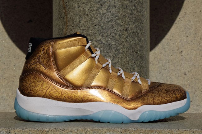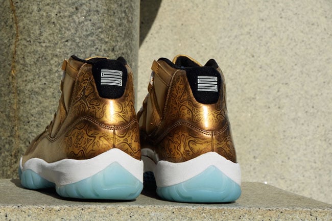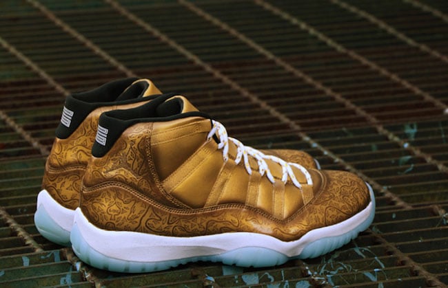 HaveAir used the Air Jordan 11 ‘Legend Blue’ as his canvas which he then transform by using Gold tonal through the uppers and tongue. Gold is used once again, this time across the patent leather that extends up through the collar. Looking closer, you will see the unique pattern throughout that also lands on the Ace of Spades bottle. Other details include a White midsole and translucent Blue outsole.