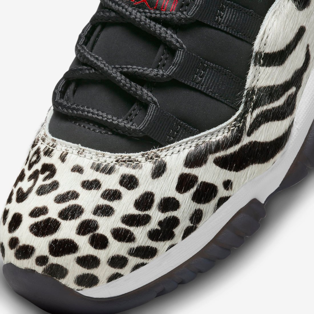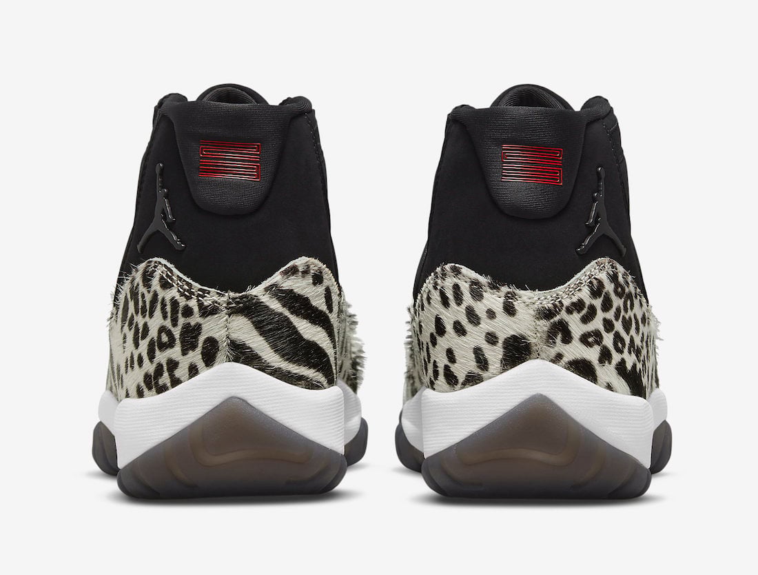 This Air Jordan 11 comes dressed in a Black, Red, Sail, and White color combination. The color blocking is similar to the โAnimal Instinctโ Air Jordan 3 that launched in 2019. Highlighted with fur on the overlays with various animal prints. Next, Black suede lands on the uppers while Red appears on the 23 on the heel. On the ankle, we have a Black metal Jumpman with White running across the midsole. Finally, a Black smoky translucent outsole finishes the look.