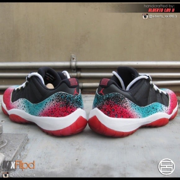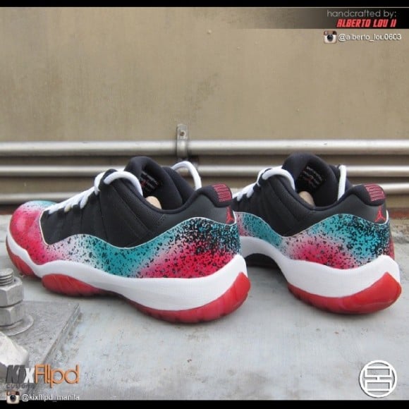 The Air Jordan 11 Low “Miami Nights” customs by Alberto Lou see a black speckled airbrushed red, blue and white pattern on the glossy uppers of the shoes. The majority of the shoes remain in the original AJ11 Low “Bred” composition, including the red outsoles and all black make-up on the top half of the uppers. Lou completely covered the patent leather panel of the shoes with the gradient pattern, and showered smaller dots of blue to go along with the already prominent black speckles, with heavy concentration on the rear of the shoes.