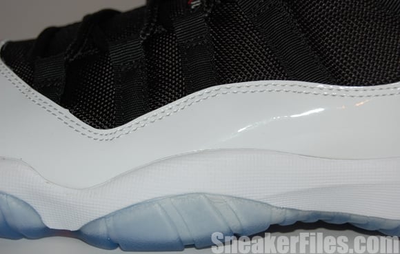 Just like your traditional Air Jordan 11, the White, Black and True Red features patent leather in white, black mesh uppers and hints of red on the tongue, heel, insole and sole. Like every release with a clear sole, the kicks will feature a blue tint.