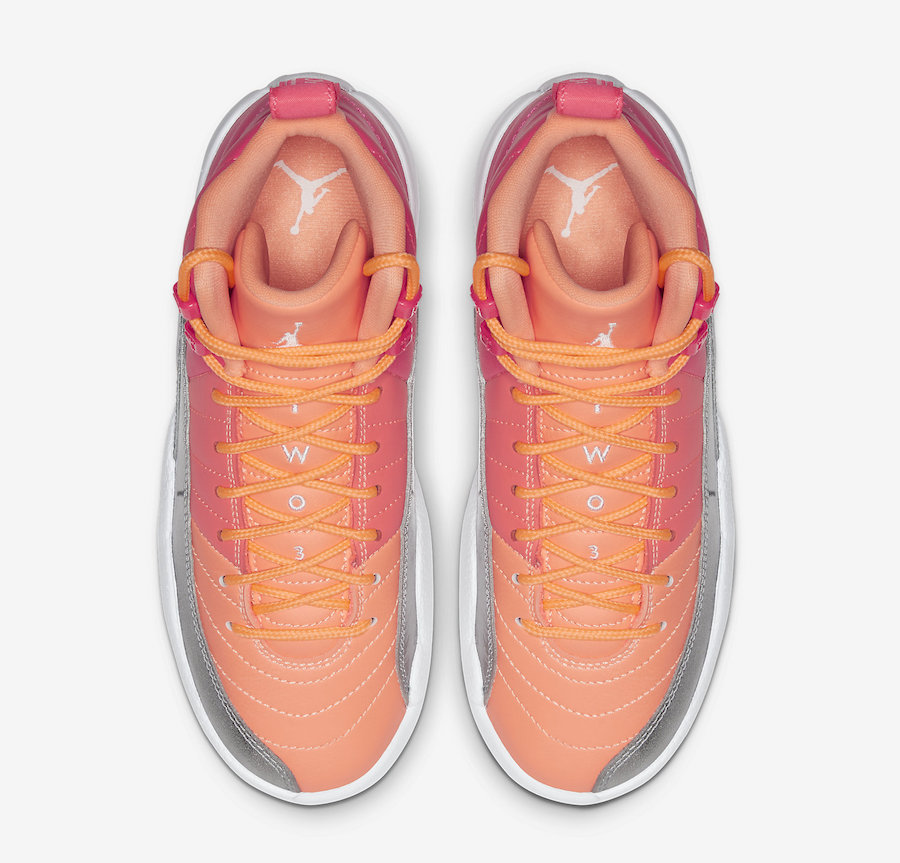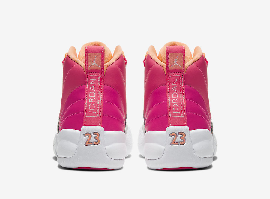 This Air Jordan 12 comes dressed in a Racer Pink, Hot Punch, Bright Mango and White color combination. As you can see this pair features tricolor blocking while Orange covers the toe, Punch lands on the mid-panel and Pink takes over the heel. Following Metallic Silver lands on the mudguard while White covers the midsole and outsole.