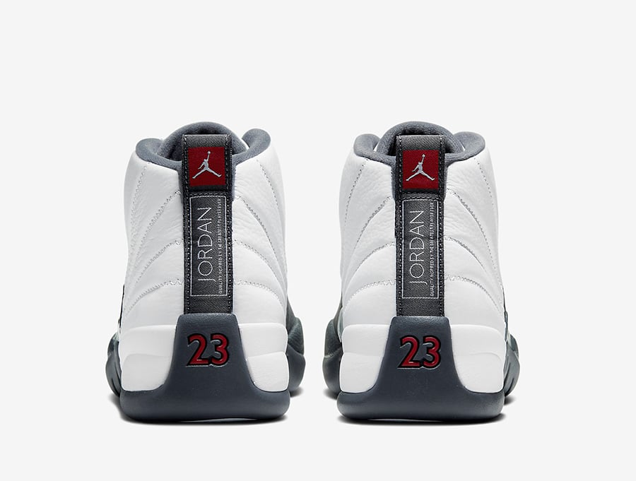 Featuring a White, Dark Grey and Gym Red color combination. This Air Jordan 12 features White leather across the upper while Dark Grey textured leather covers the mudguard. In addition we have more Grey on the heel, liner and rubber outsole. Metallic Silver lands on the top two eyelets and branding overlay on the lateral side. Completing the look is Gym Red on the branding.