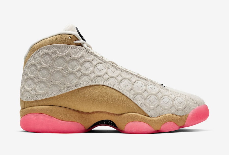 This Air Jordan 13 comes dressed in a Pale Ivory, Black, Digital Pink and Club Gold color combination. Highlighted with Ivory on the base along with Chinese inspired graphics debossed throughout which is in the shape of a coin. Following we have Gold nubuck across the lower part of the shoe and heel while Pink lands on the midsole which completes the look.