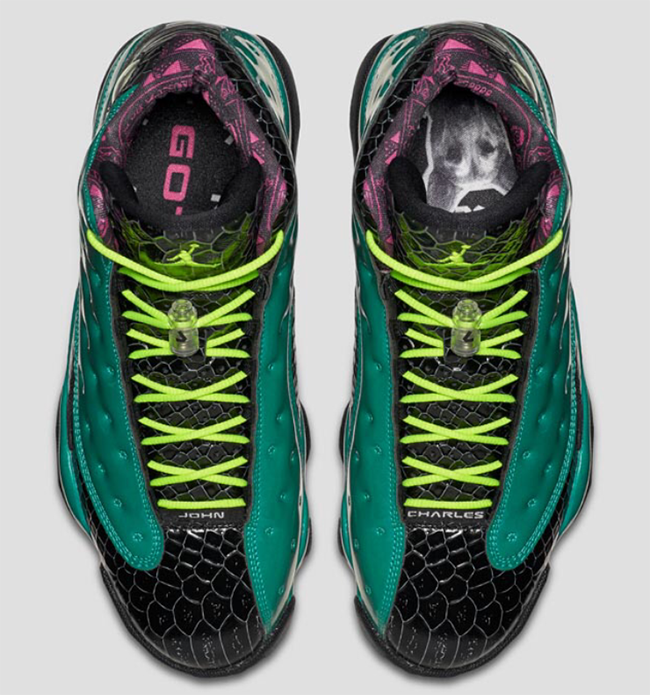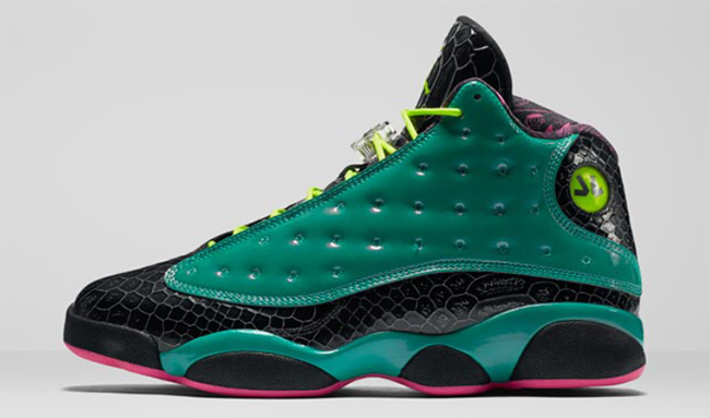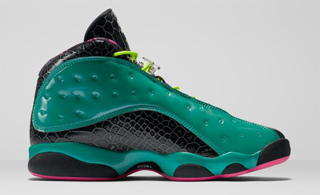 As for colors and material, the DB Air Jordan 13 is different from anything we have seen before. You will notice that a shade of green with patent leather lands on the pods while black with a reptile overlay runs down the tongue, toe box and mid area. Neon green or volt is added on the laces, Jumpman logo and hologram while pink lands on the outsole and liner.