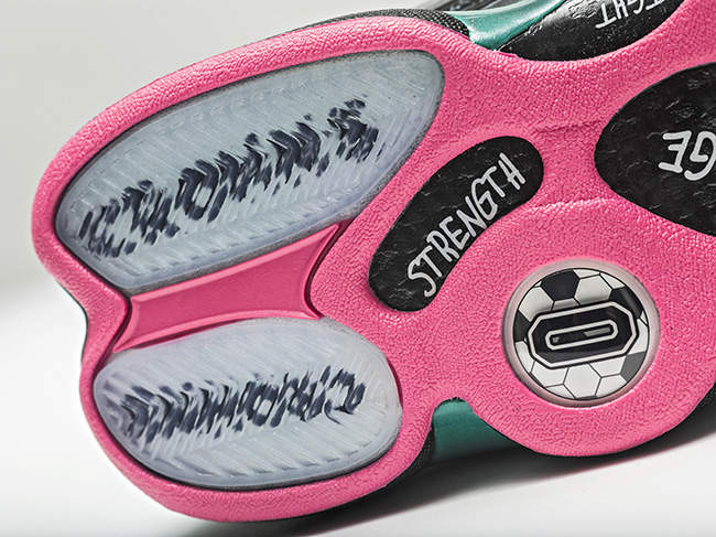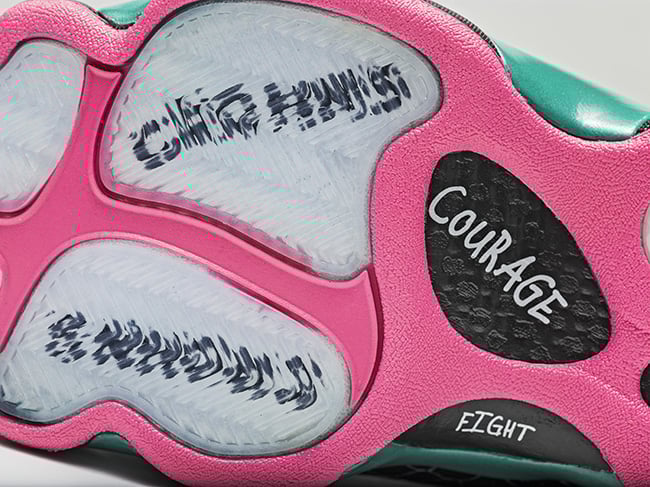 Update: The ‘Doernbecher’ Air Jordan 13 won’t be unveiled till October 23rd, however a teaser image has leaked which shows off the sole. As you can see they feature pink along with translucent pods, a soccer ball and inspirational words like ‘Courage’. More than likely we will see the Jordan 13 Doernbecher before the official unveiling so stay tuned.