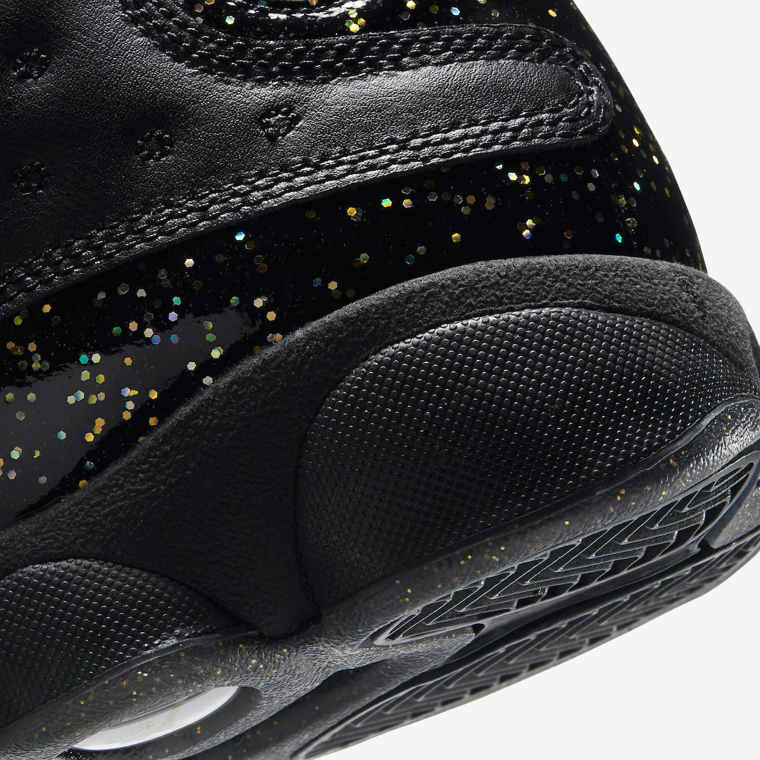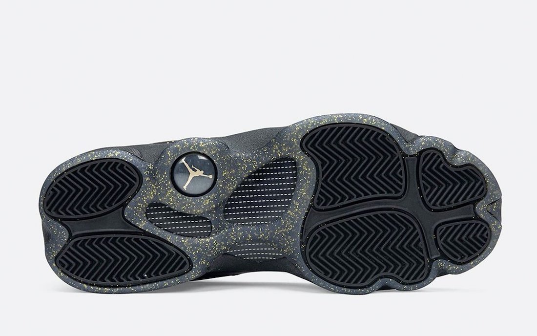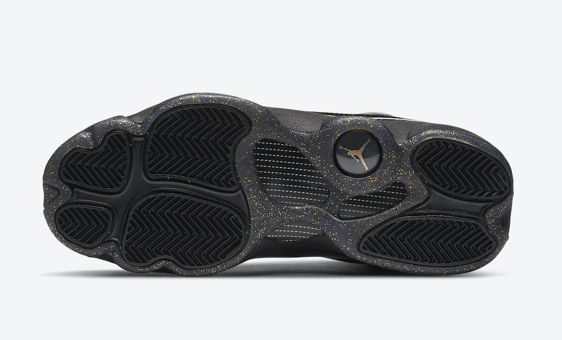 This grade school exclusive Air Jordan 13 comes dressed in a Black and Metallic Gold color combination. As you can see, the panels and toe feature Black leather while the signature dimples land on the panels. Furthermore, Black also takes over the tongue, laces, and liner. Sticking out the most, Gold speckled details runs across the lower part of the panel, wraps the heel, extend across the medial side, and outlines the mostly Black outsole. Following, White adorns the Jumpman on the tongue and Gold โJordanโ label. Finally, Black on the midsole and the traditional hologram by the heel finishes the look.