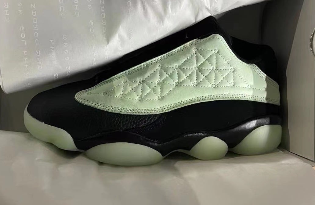 This low-top Air Jordan 13 comes dressed in a Black and Barely Green color combination. Looking closer, the pair has Black tumbled leather on the toe box while Black nubuck covers the heel and collar. Next, Barely Green leather drapes the panels which is highlighted with an embroidered geometric pattern along with โAir Jordan 0023โ and โ1111 Low,โ which also lands on the wrapping paper. Lastly, we have Black on the midsole and Barely Green on the outsole, which could possibly glow in the dark.