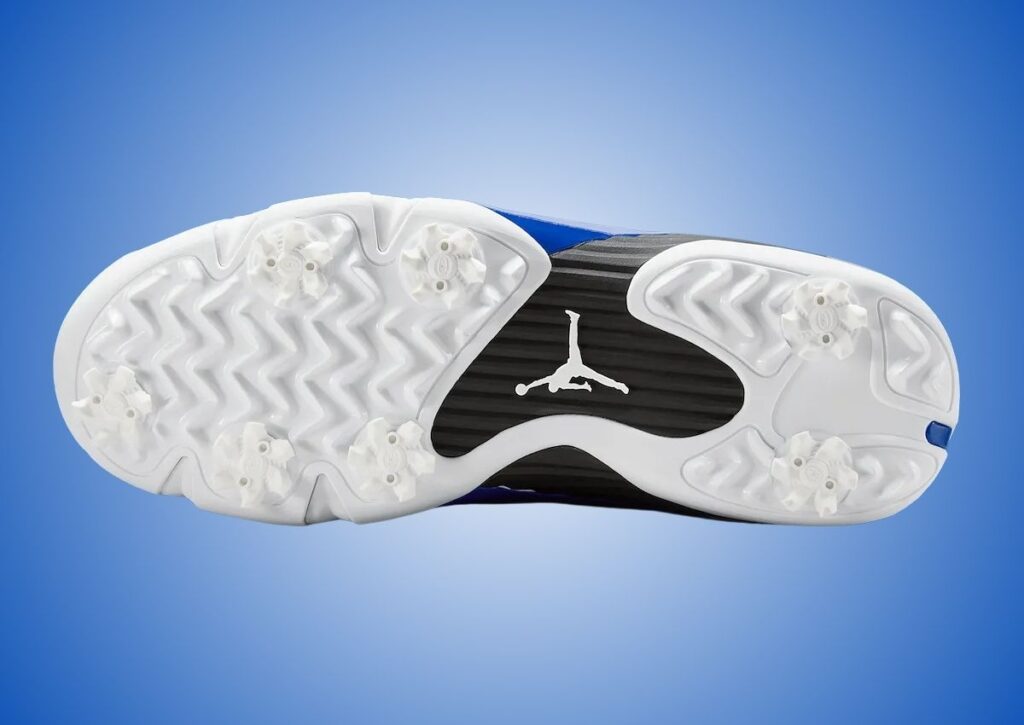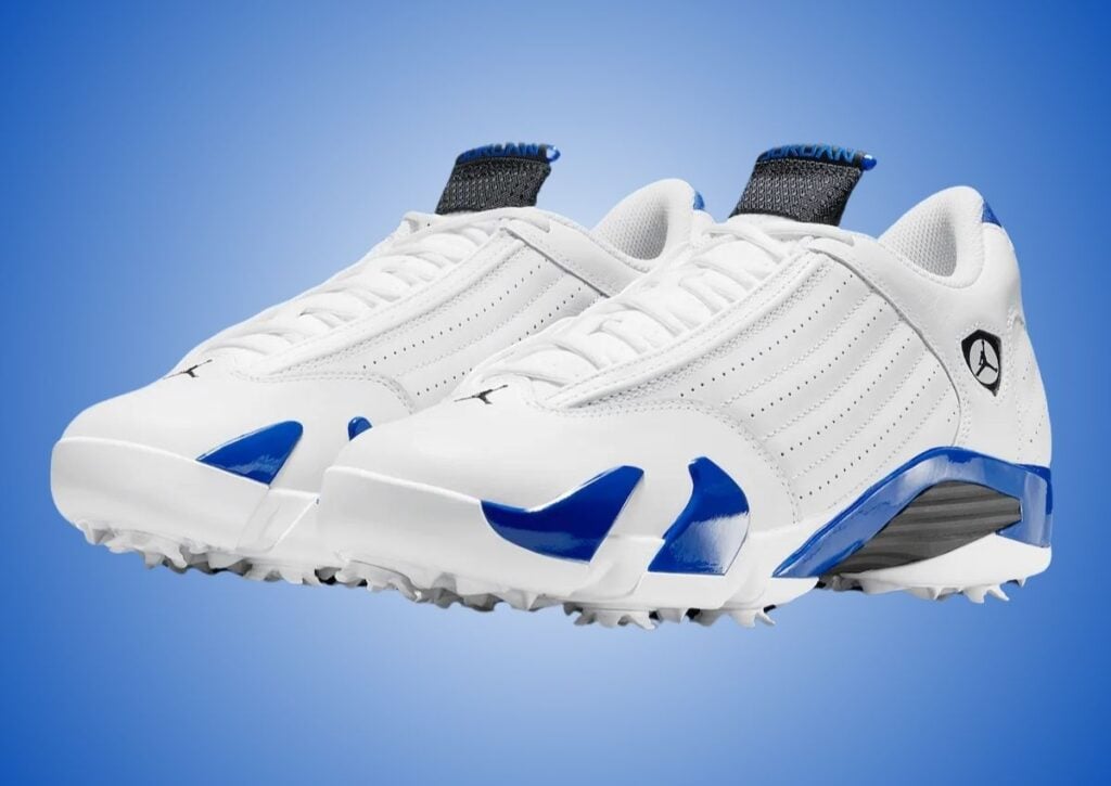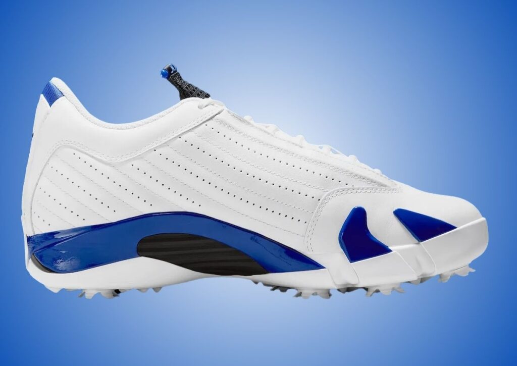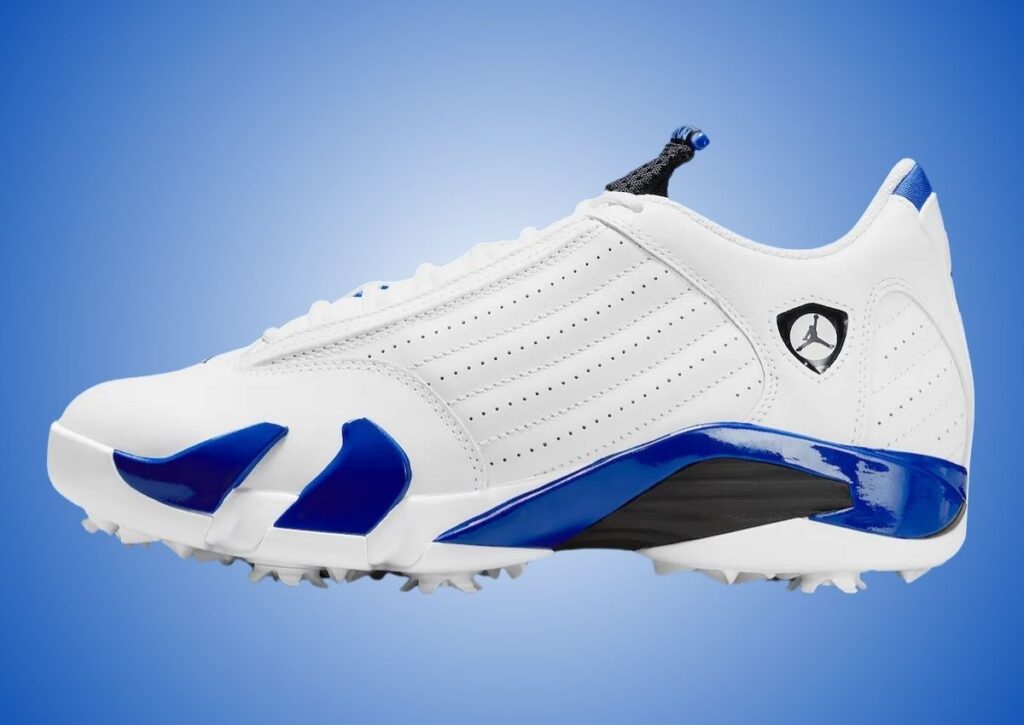 If this Air Jordan 14 Golf looks familiar, we saw the colorway applied to the basketball version. The โHyper Royalโ Jordan 14 was initially launched in 2020. However, the pair will return with spikes on the outsole and a slightly modified upper.