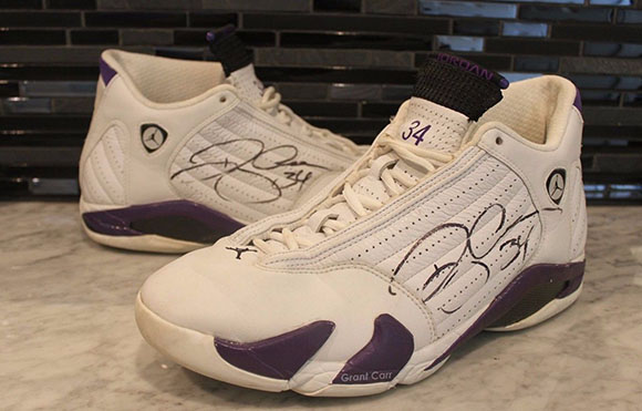 When Ray Allen laced up his Air Jordan 14 Milwaukee Bucks PE’s, they were the newest Jordan’s at the time. Might make some of us feel old (we know Ray does). They feature a white base and purple on the midsole, tongue and heel (at the time this was one of the Bucks colors). His number of 34 lands on the tongue and on top of it all, the pair is signed by Allen.