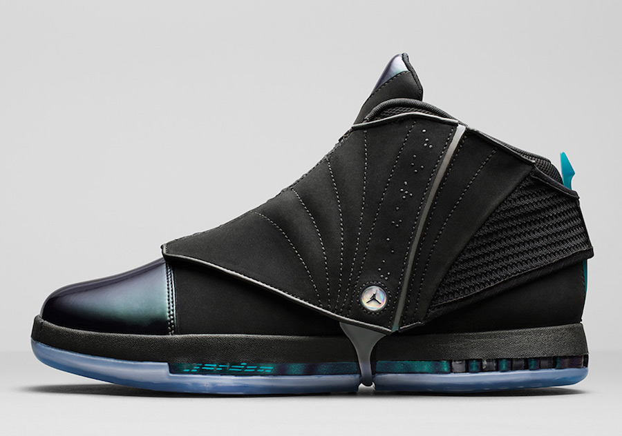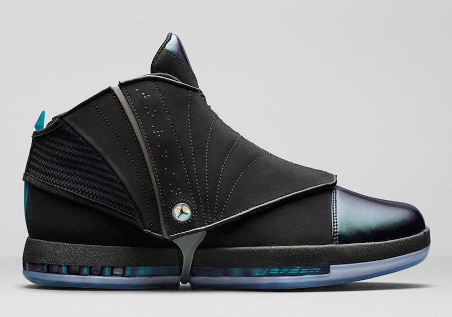 This Air Jordan 16 mimics that of the Hornets color combination. Looking closer you can see that Black takes over most of the uppers while suede is used on the panels and shroud and patent leather is applied to the toe with an iridescent finish. Furthering the theme we have Teal accents spread out. Each pair is individually numbered which is displayed on the inside of the tongue. Finishing the look is a translucent outsole.