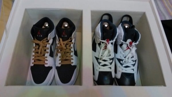 Where our preview earlier this week only gave us a glimpse as the celebratory pack, our latest look hones in on this box sets’ pristine packaging as well as its feature Air Jordan 1 and Air Jordan VI (6) retros.ย Moreover, flag decals can be seen alongside each lateral heel whereas USA color-ups dominate each shoe. If that’s not enough, new images reveal wooden shoe trees, clear packaging, dust bags, a themed Nike Destroyer jacket and hat. Could this be the ultimate Olympic pack dedicated to the Dream Team?
