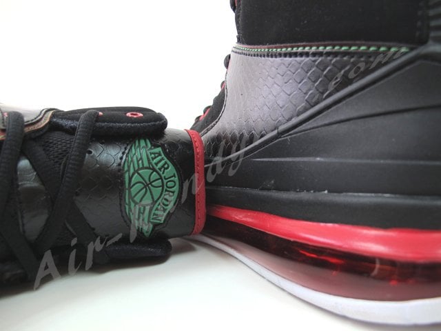 Black nubuck is featured along the upper along with a leather toe rand and side panel textured with reptile print. Pink accents are present on the 360 Air Max bag, outsole, midsole and eyelets with green contrast stitching and Air Jordan Wings logo sitting atop a white outsole.