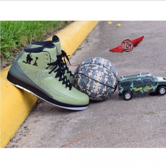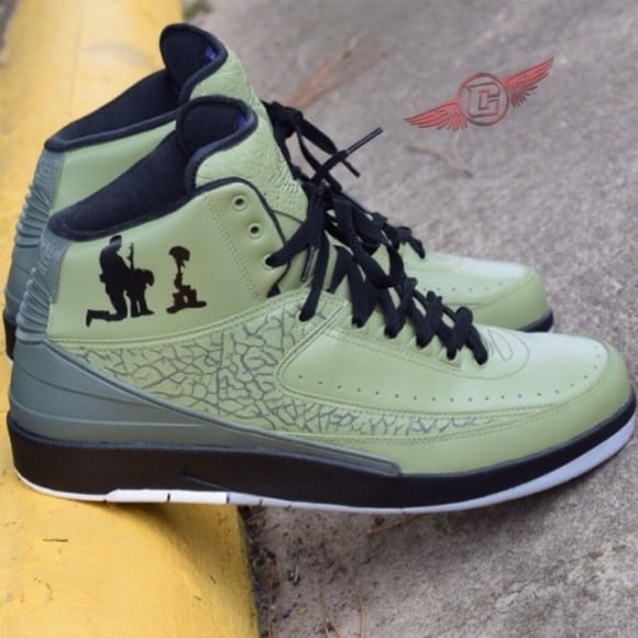 The Air Jordan 2 “Fallen Soldier” customs by Ceesay14 arrive in a mostly mossy green tone with grey accenting present throughout the shoes. Grey adds its contribution with elephant print on the midfoot panels and rear heel guards of this Air Jordan 2 sneaker. The silhouette of a kneeling soldier paying his respects is present on the ankle collars of the rear paneling, which accentuates the black lacing and midsole.