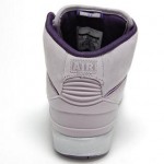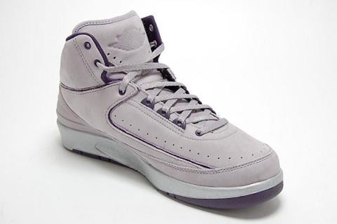 Here we have the GS Jordan 2 Retro in a Lavender/ Deep Purple- Del Sol color combo. The entire upper is lavender suede. Deep purple is used to compliment this on the piping, eyelets and collar lining and outsole. Del Sol can hardly be seen, but it is on the laces in a somewhat glitter looking fashion.