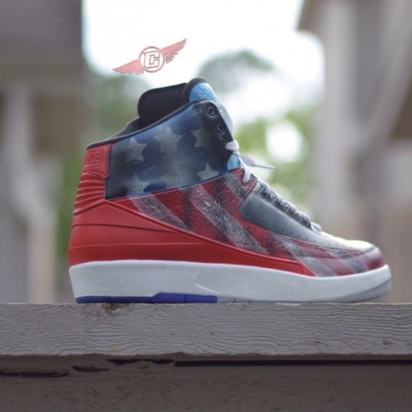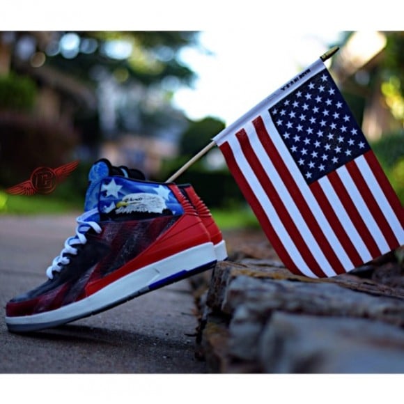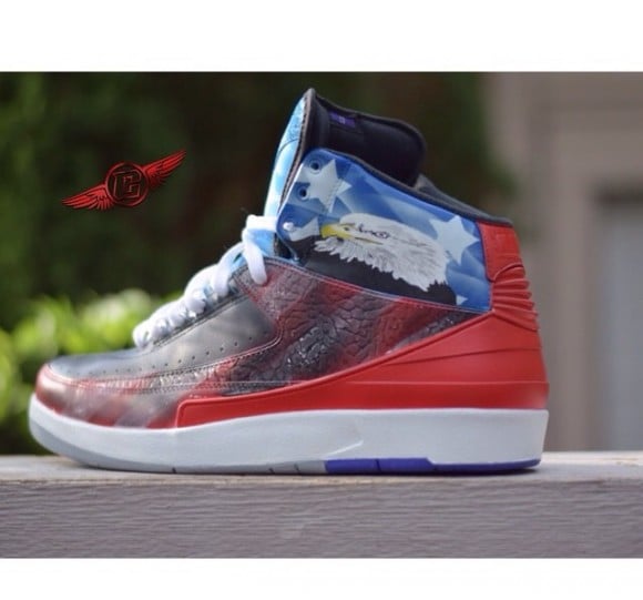 The Air Jordan 2 ‘Independence Day’ customs by Ceesay14 feature painted artwork of the bald eagle, in addition to patriotic stars and stripes. Tones of red, white and blue make up the shoes, with red being the most dominant, especially on the rear paneling. A prominent bald eagle appears on the outside of the shoes, while a grainy pattern of white stars and red stripes plague the uppers.