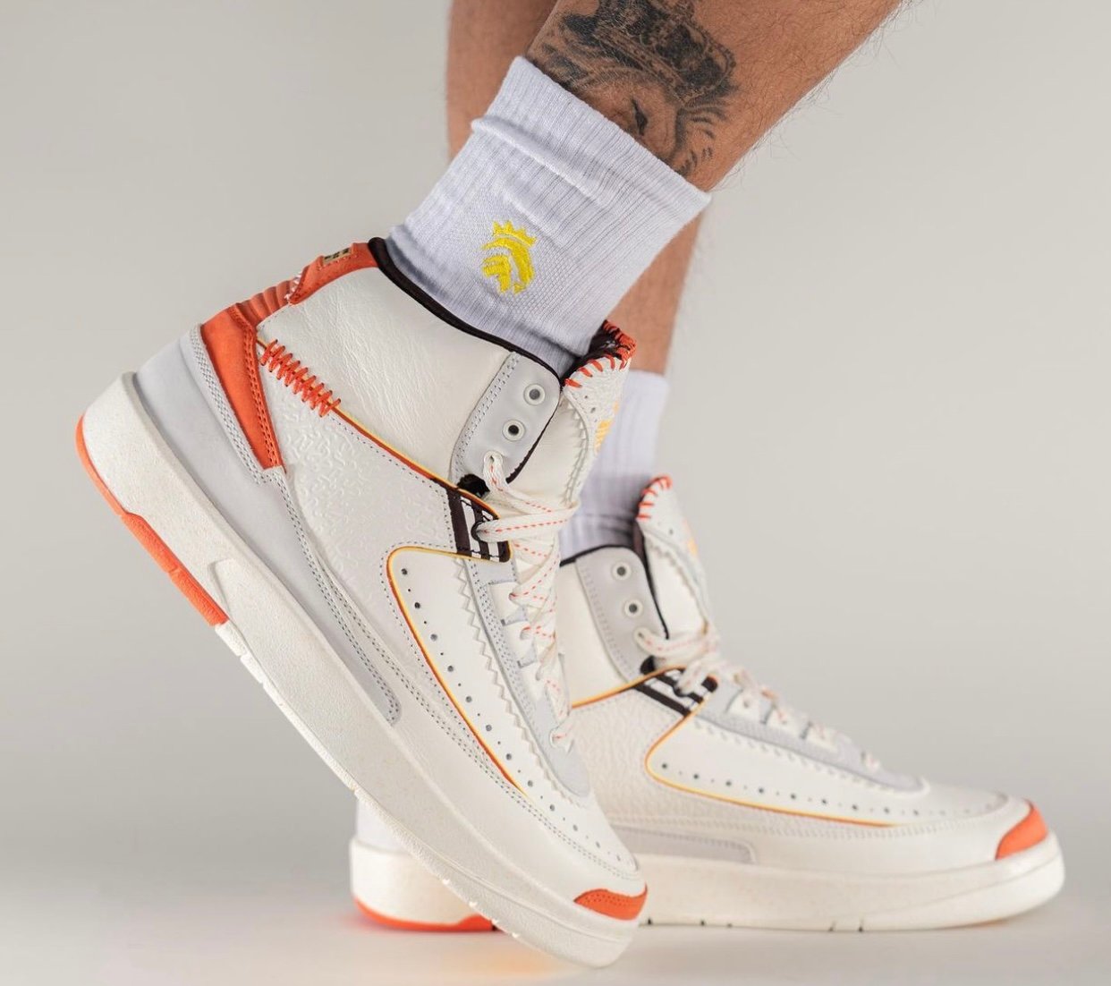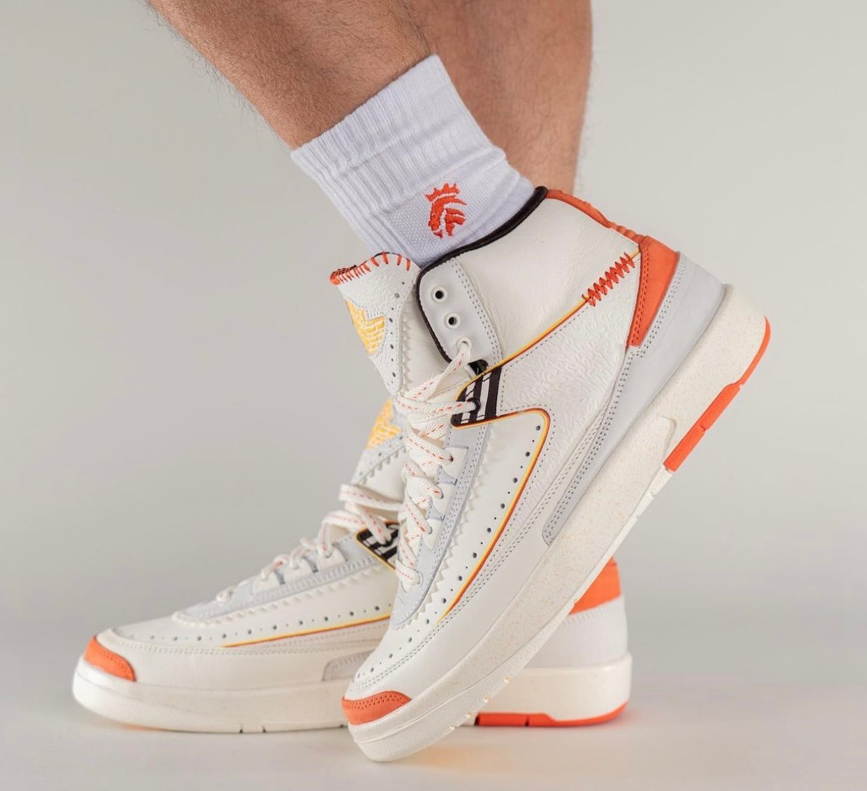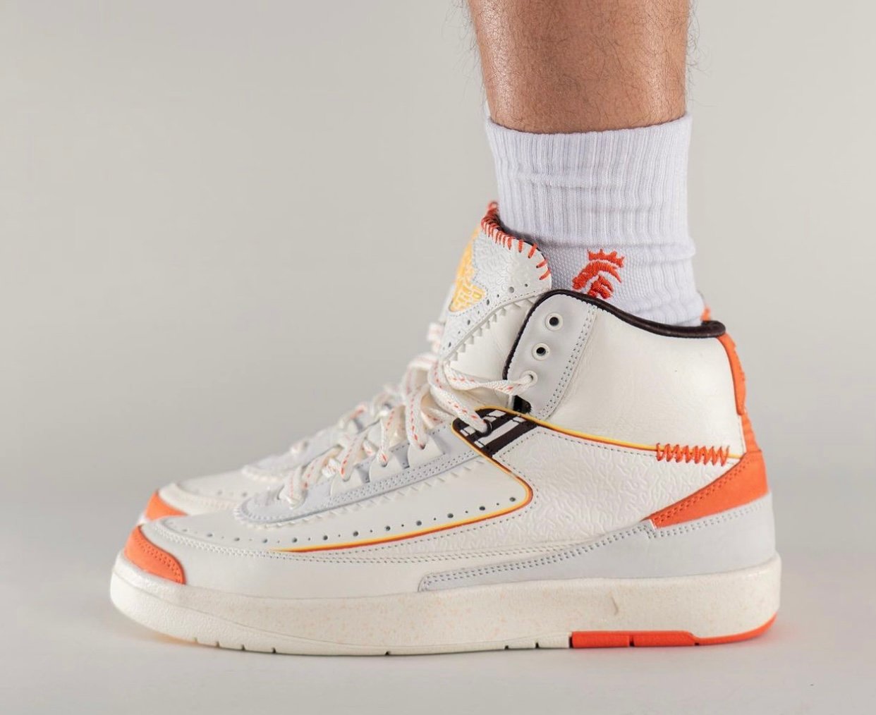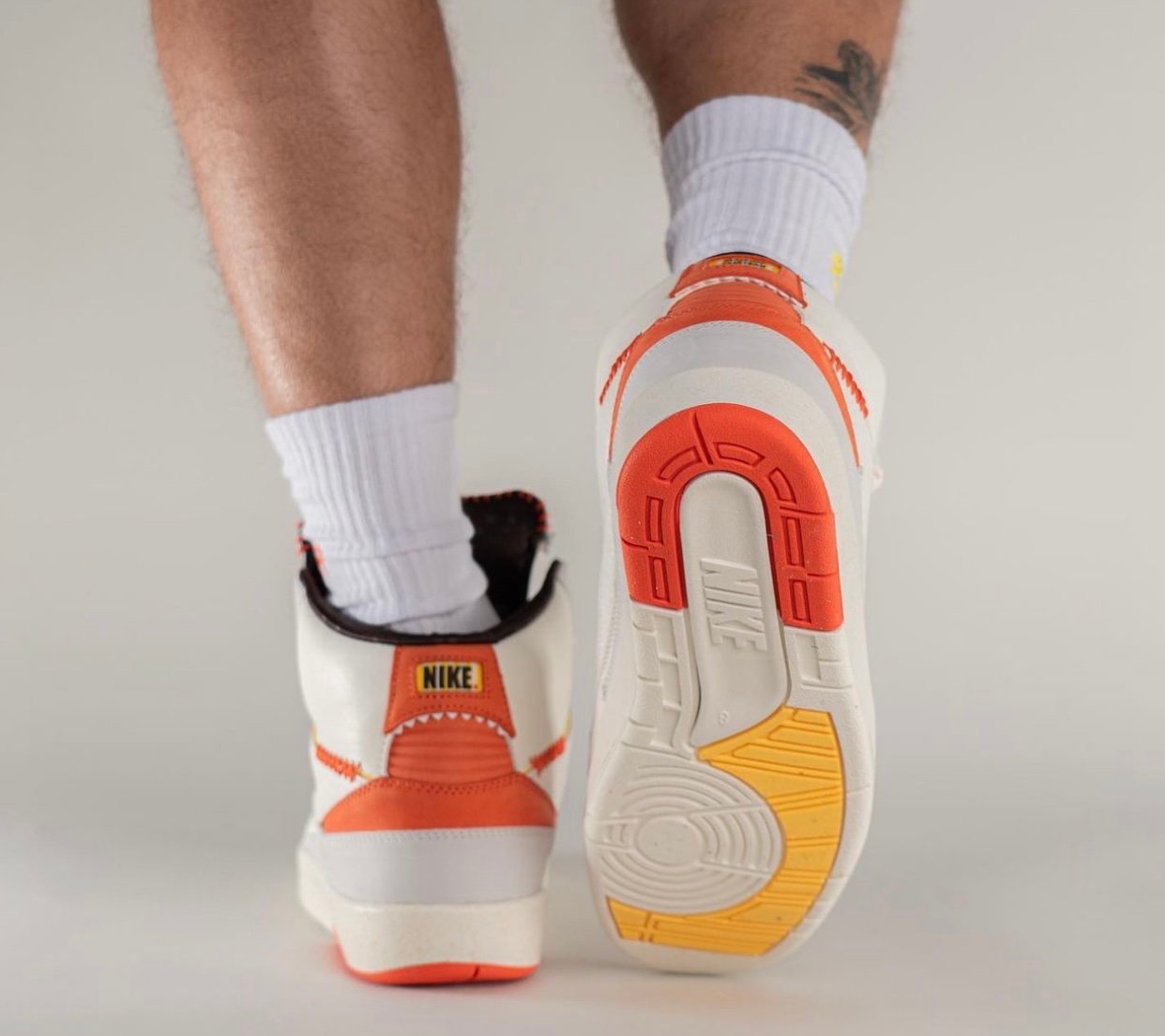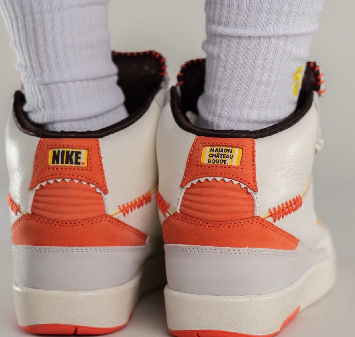 The end result is a flashy and eye-catching Maison Chateau Rouge x Air Jordan 2 that utilizes colors reminiscent of Shattered Backboard releases. Highlighted with Sail leather on the upper, Orange detailing throughout, contrasting stitching, and layered eyestays. Next, we have debossed patterns, โMaison Chateau Rougeโ branding on the heel, โUnited Youth Internationalโ and โChicago Dakar Parisโ on the inside of the tongue. Lastly, we have a special graphic of Michael Jordan on the insoles and each pair comes with an extra set of laces.