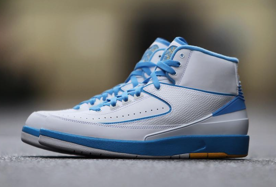This Air Jordan 2 comes dressed in a White, Varsity Maize and University Blue color scheme. Constructed with a White leather base along with accents reptile texturing. University Blue is then applied on the pipping, laces, Wings branding on the tongue (along with Varsity Maize), heel and midsole. Finishing the look is Yellow which is the Nike block lettering on the heel and hinted on the outsole.
