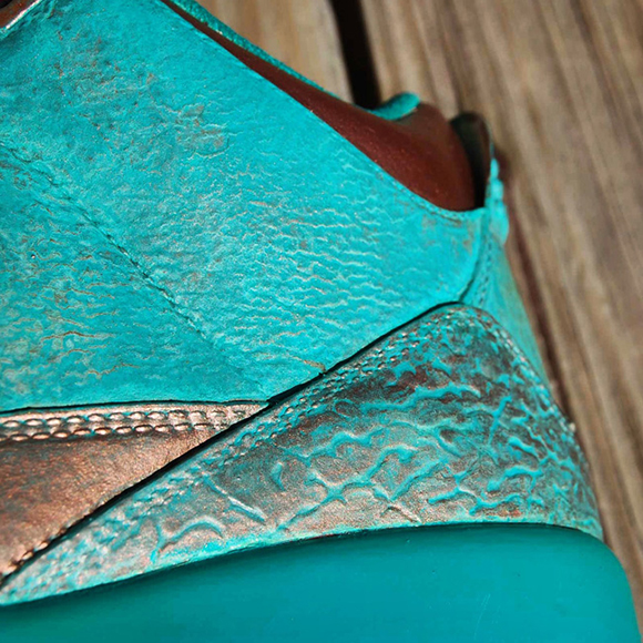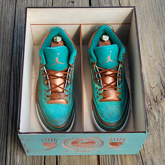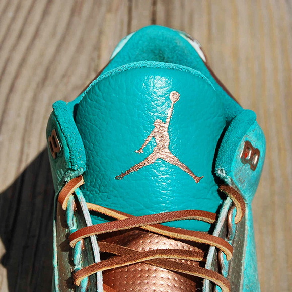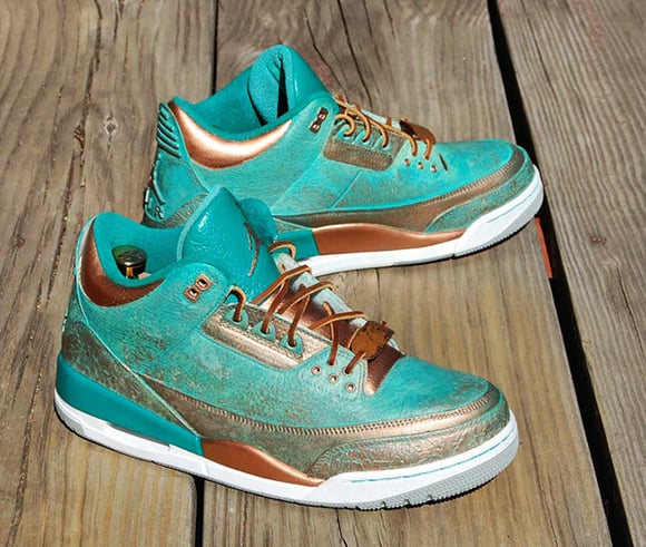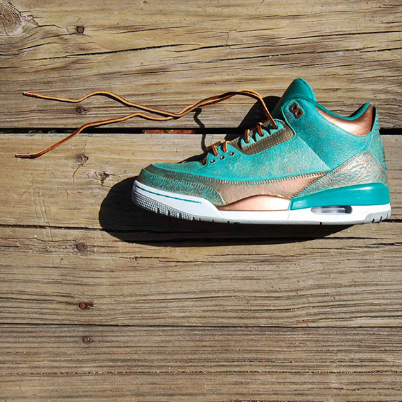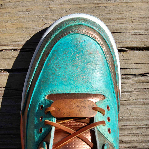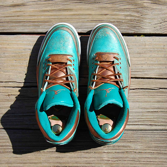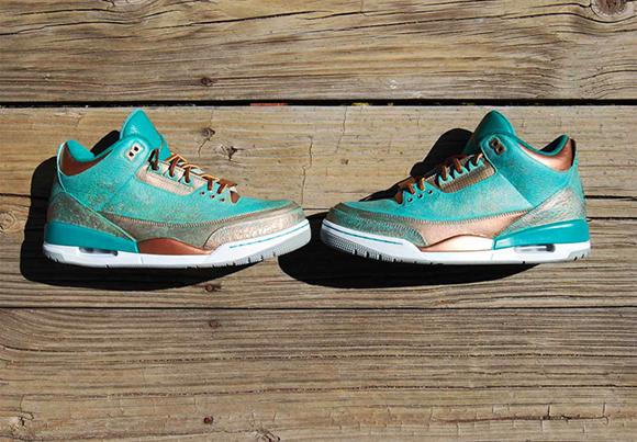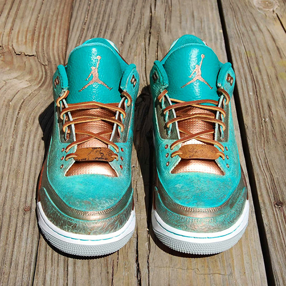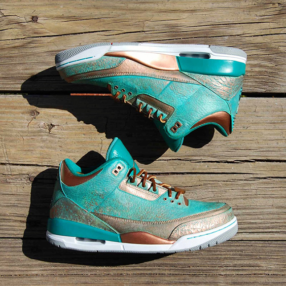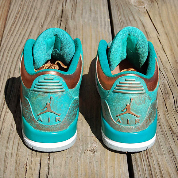 Also known as PaThreena or PaIIIna, the Pa3na Air Jordan 3 Custom uses patina effect across the uppers with overlay effects across the panels. The elephant print is brushed with copper on the surface while the groves have the bluish patina embedded for contrast. A light coat of copper is also used with some of the patina texture to shift in colors once the light hits.