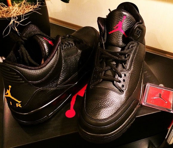 Using the Air Jordan 3, one pair features all black uppers and the other white with tumbled leather. At first glance it appears this pair used the same materials as the remastered Air Jordan’s coming next year. The Jumpman logo on the tongue looks to be in red while the heel is in gold. One of the insoles has the OVO owl and the other the “Drake vs. Lil Wayne” street fighter inspired logo for their tour.