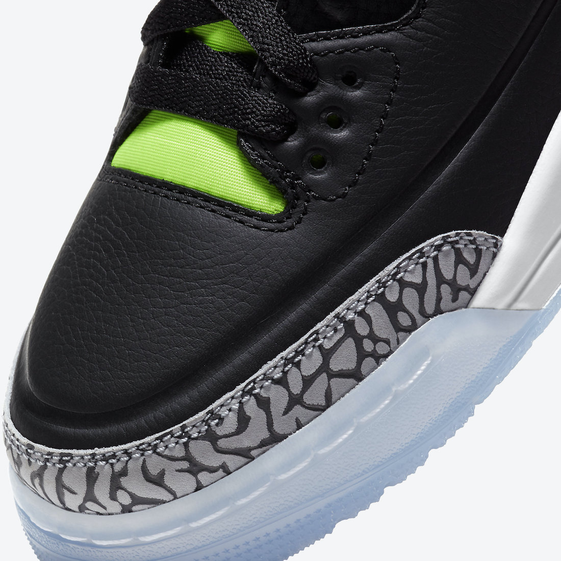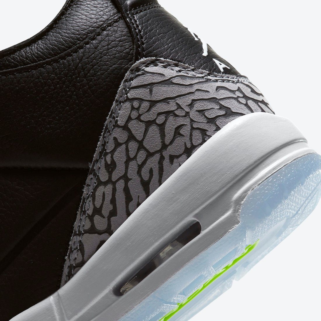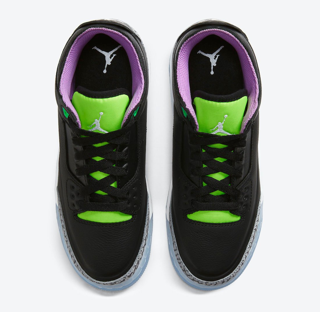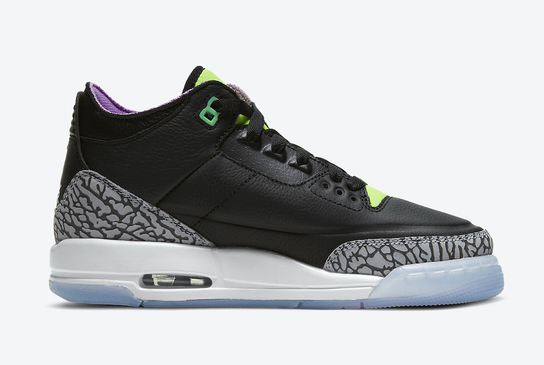 This Air Jordan 3 comes dressed in a Black, White, Electric Green, Violet Shock, and Green Glow color combination. Utilizing Black leather on the upper while elephant print wraps the toe and heel. Next, we have both Purple and Green accents throughout while a darker shade of Green adorns the top eyelets. Lastly, we have a White Jumpman logo on the heel, the same shade across the midsole, while a translucent outsole finishes the look.