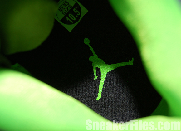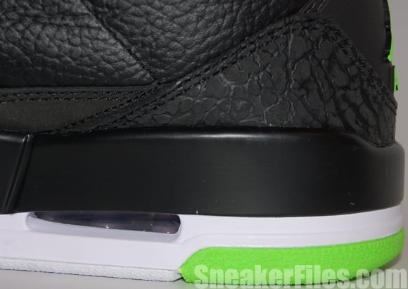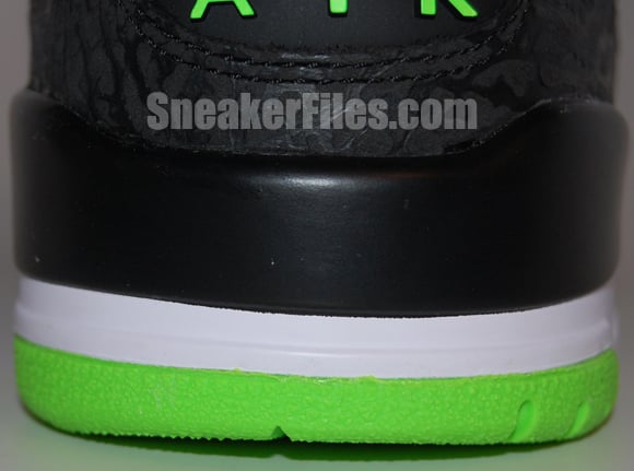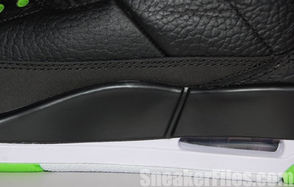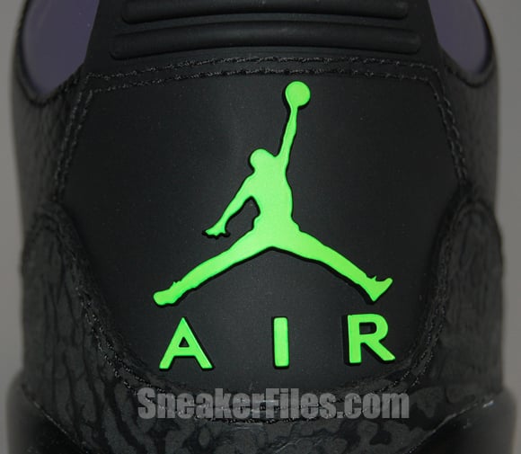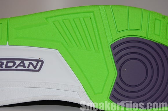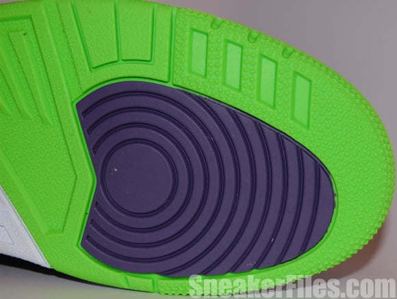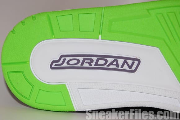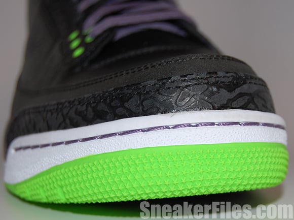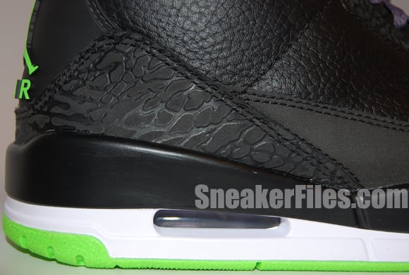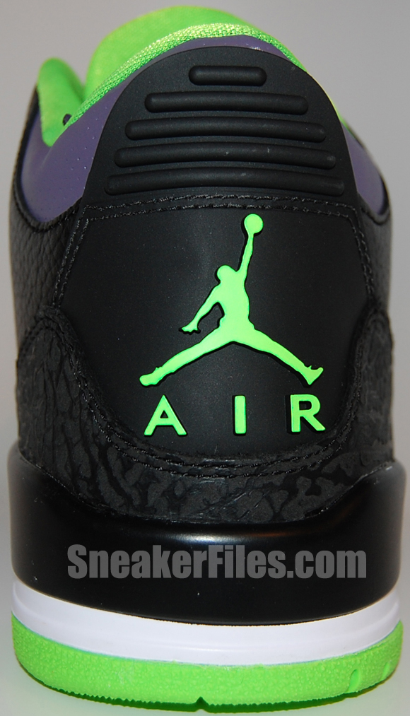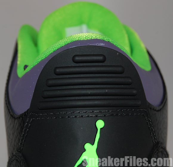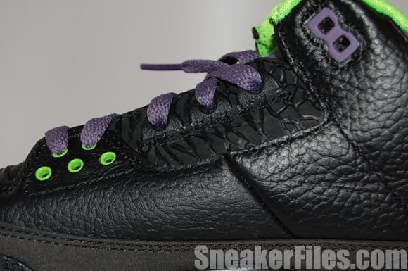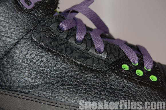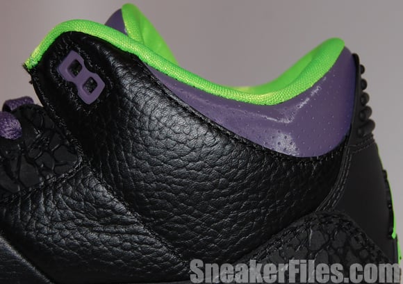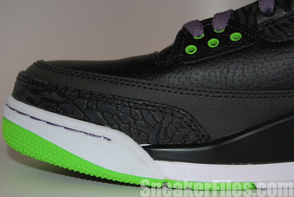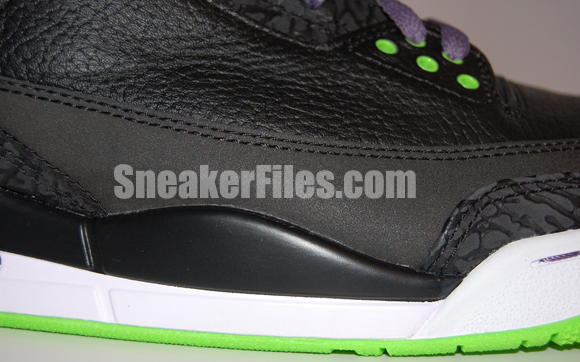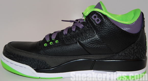 The Joker Air Jordan III 2013 uses black tumbled leather uppers, purple around the collar, laces, sole and stitching, electric green on liner, sole/outsole, eyelets and Jumpman logo on the tongue and heel. Lastly, white is placed around the midsole.