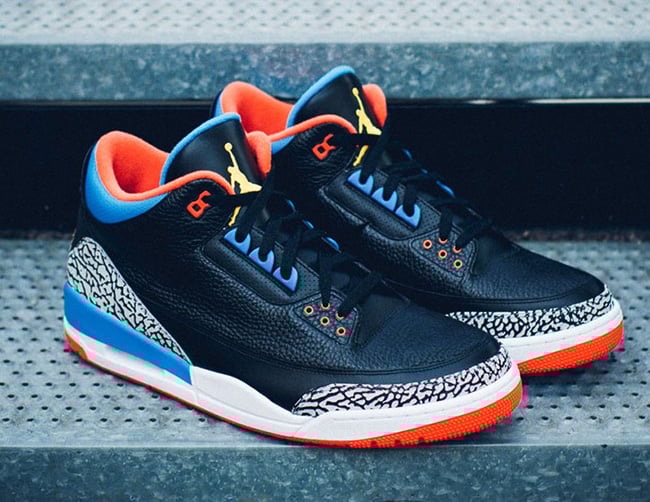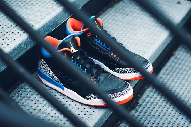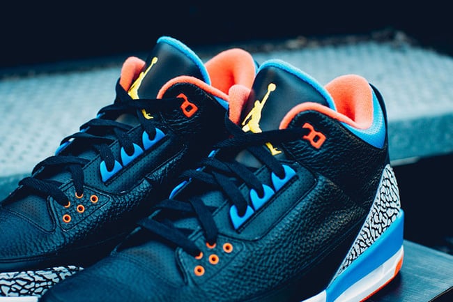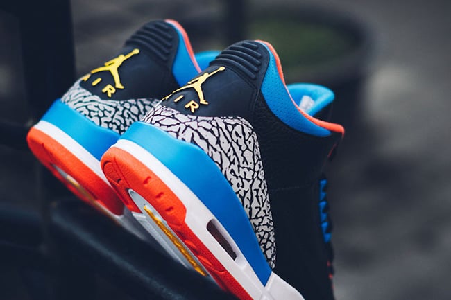 As you can see, this Air Jordan 3 comes in the OKC Thunder Away colorway. Black is predominately used through the uppers and across the heel while constructed with leather. Your traditional elephant print runs in itโs normal locations while White hits the midsole. Blue and Orange are spotted on the eyelets, collar, liner and outsole while Yellow lands on the Jumpman.