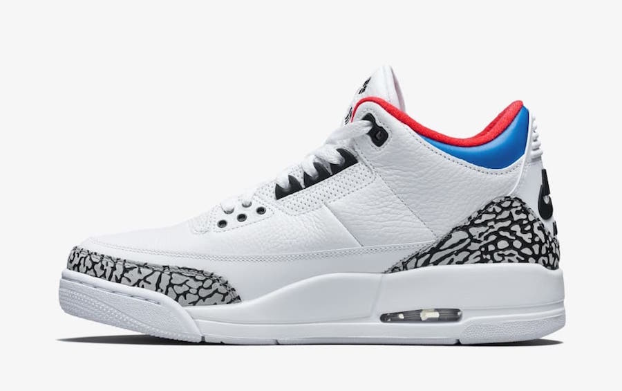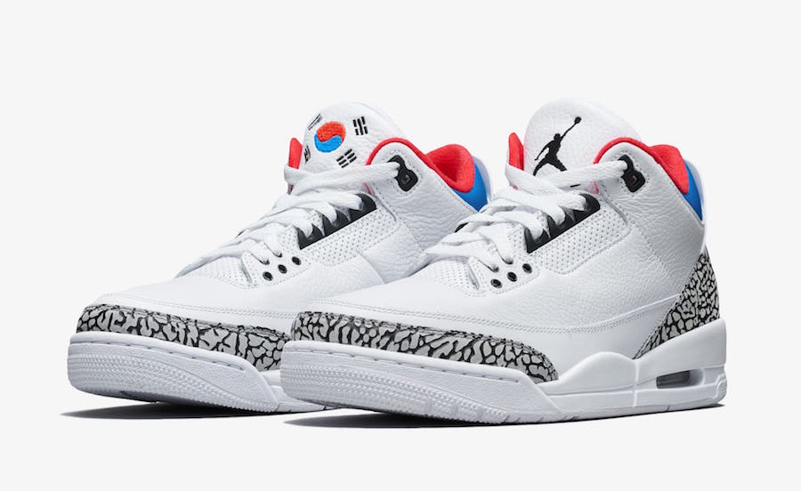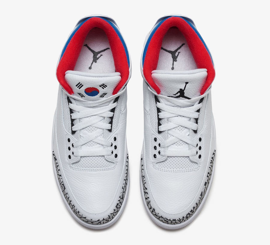 The Taegukgi (Korean flag) inspires the shoeโs overall color scheme, with the โtaegukโ symbol expressed through the lining and collarโs blue and red and the white upper representing peace and purity (as it does on the flag). ์์ธ (Seoul) is featured on the left inner tongue, while the 1988 summer games motto ํํฉ๊ณผ ์ ์ง (Harmony and Progress) is featured on the right inner tongue. The heel reads โNike Airโ in a clear nod to the original Air Jordan 3.