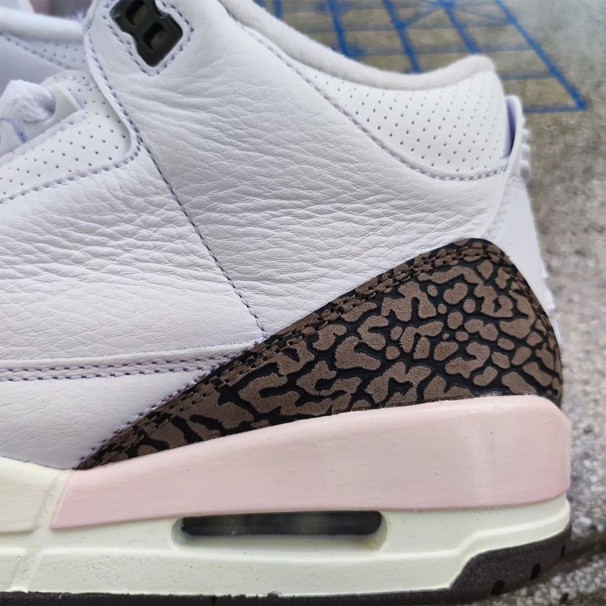 This Air Jordan 3 features a White, Dark Mocha, Atmosphere, and Sail color combination. Furthermore, the pair somewhat resembles the โMochaโ Air Jordan 3 from 2018, but with a Neapolitan-like twist. Utilizing White on the uppers while Dark Mocha covers the elephant print that wraps the toe and heel. Other highlights include Sail on the midsole, Atmosphere Pink on the midsole and tongue branding, and a Mocha rubber outsole.