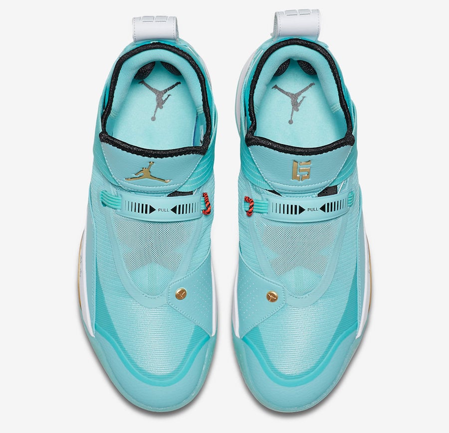 This Air Jordan 33 will be an SE which features Teal throughout the upper while accents of Gold land on the branding. In addition we have minimal hints of Red, Nike Air on the heel, Chinese writing on the midsole while a glow in the dark outsole finishes the look.