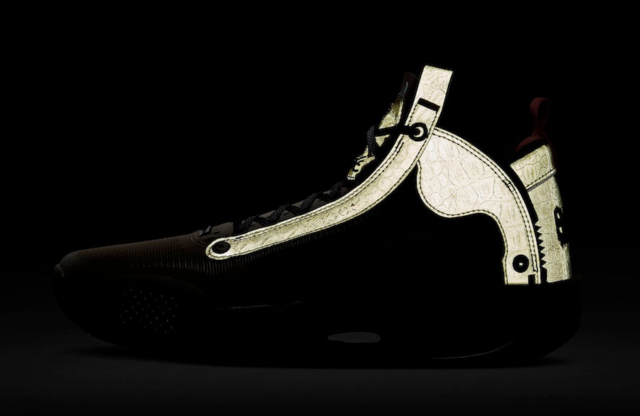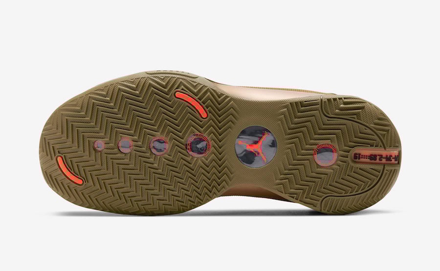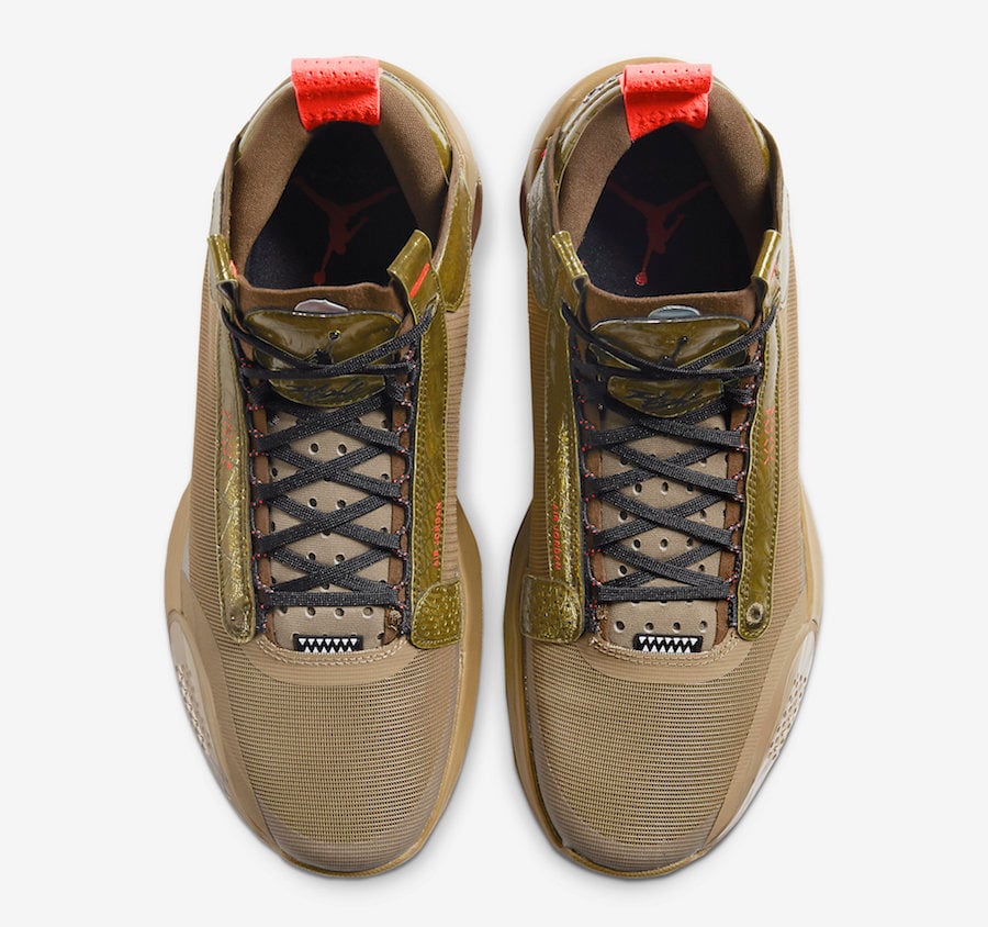 This Air Jordan 34 features a luxurious theme while utilizing faux gator material which is inspired by Williamsonโs play in the Bayou State and his aggressive playing style. Utilizing shades of Green and Khaki throughout, while sharp teeth lands on the base of the tongue. Other details includes โBayouโ on the heel as well as Orange detailing.