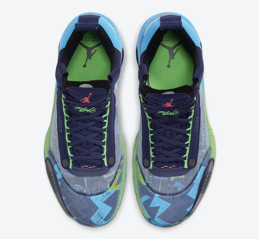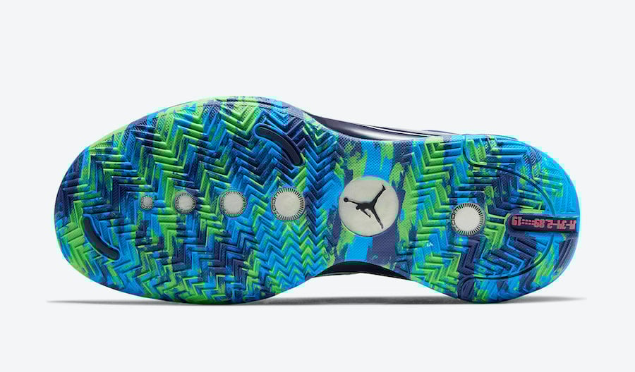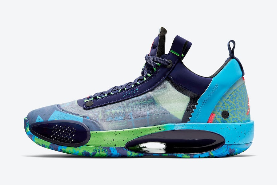 This low-top Air Jordan 34 comes dressed in a Regency Purple, Rage Green, Persian Violet and Flash Crimson color combination. The unique patterns along with the colors is reminiscent of what Jordan Brand did on the โBel-Airโ Air Jordan 5. In addition we have a marble like design across the rubber outsole.