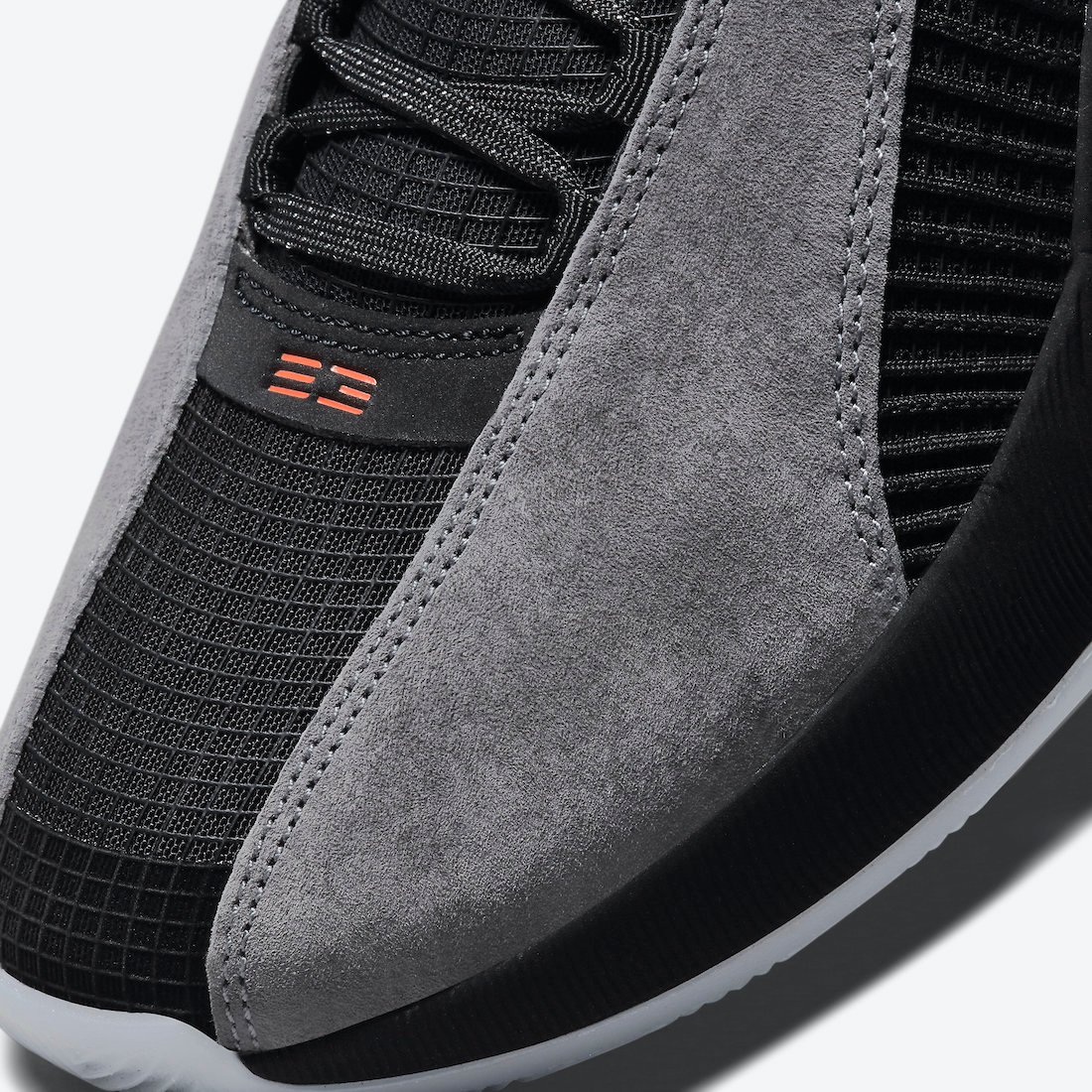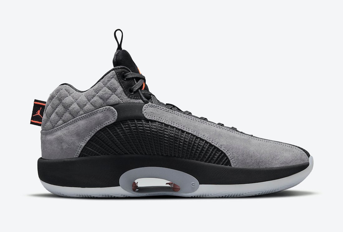 Looking closer, this Air Jordan 35 comes constructed with Grey suede on the overlays while quilt-stitching lands on the ankle collars. Expanding on the premium look, we have mostly Black throughout while Orange hits the Jumpman, 23, and Nike Air branding. Finally, a Cool Grey Eclipse plate and a translucent outsole finish the look.