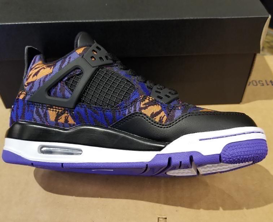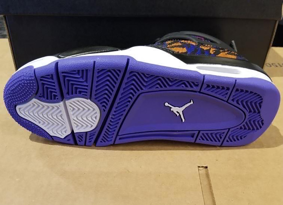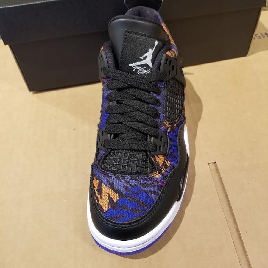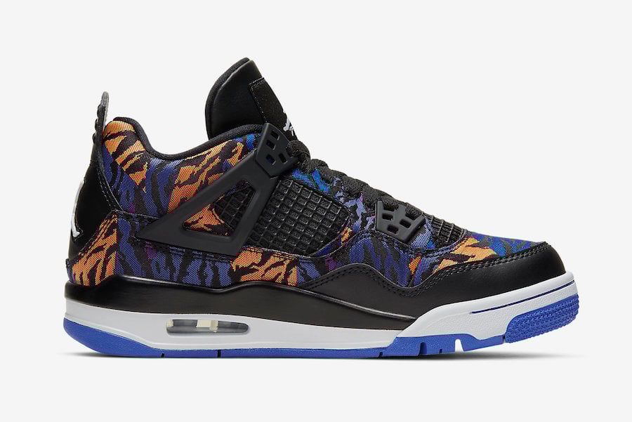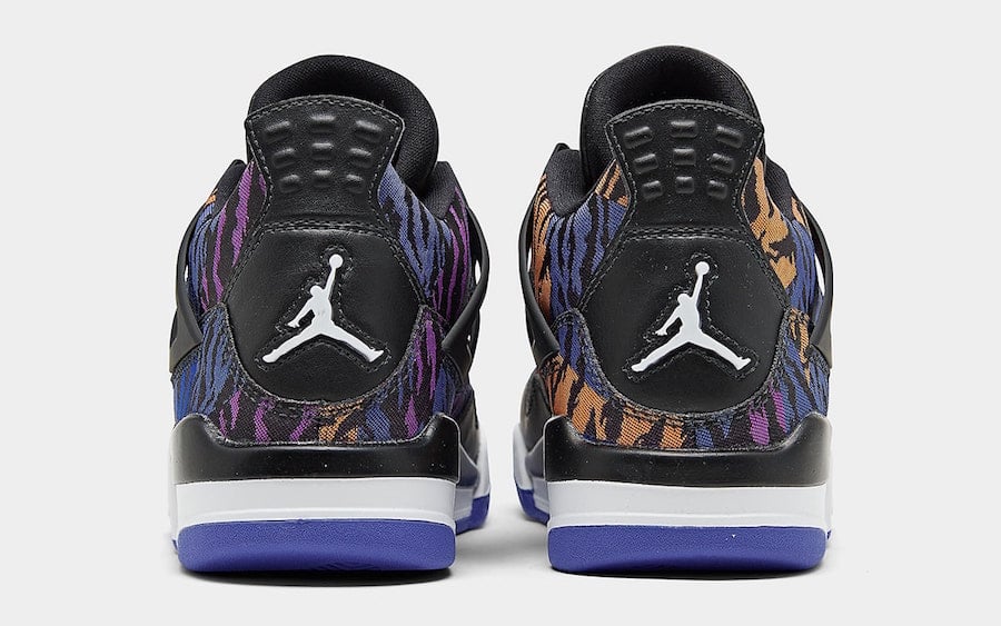 Dressed in a Black, White, Rush Violet and Racer Blue color combination. This Air Jordan 4 features Black leather on the mudguard, tongue, eyelets, mesh and liner. On the upper we have โTiger Camoโ which displays both Rush Violet and Orange. Other details includes White on the midsole and Purple on most of the rubber outsole.