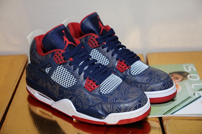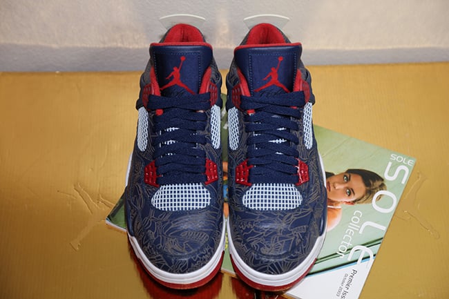 What is somewhat odd is that the Air Jordan 4 Melo Olympic 2008 Laser is actually a size 9 and not Carmelo Anthony’s size 15. Maybe at one point the Brand thought about releasing them, or just wanted to distribute pairs to friends and family. You can check out more images below and let us know if you would buy if JB released them.