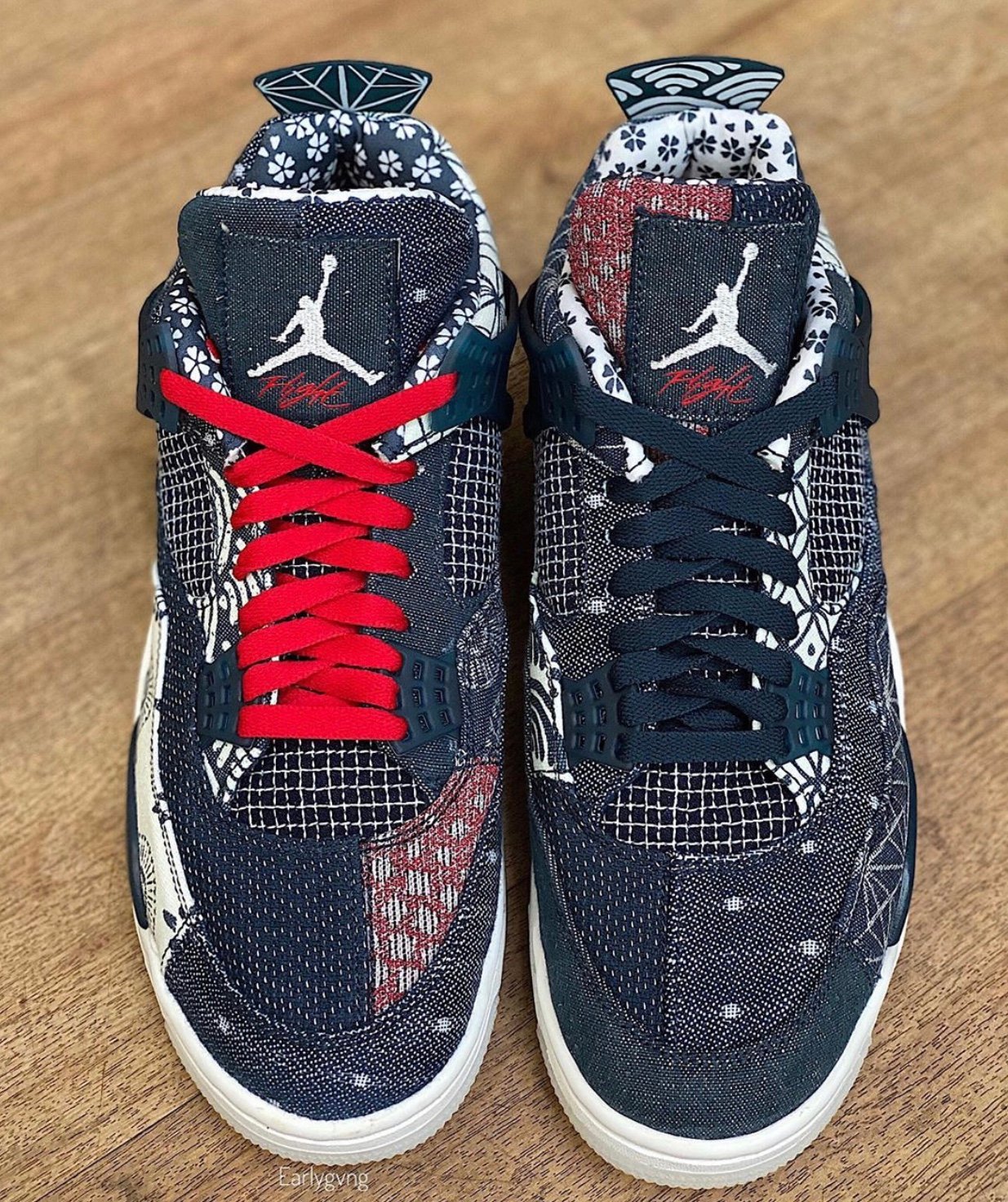 Furthermore, it comes dressed in a Deep Ocean, Sail, Cement Grey, and Fire Red color combination. This Air Jordan 4 comes with patchwork throughout the upper along with mismatched laces, liners, and tongues. In addition, it has Japanese motifs throughout and a translucent heel tab. Sail appears on the midsole, and lastly, we have a translucent outsole and comes with a special box.