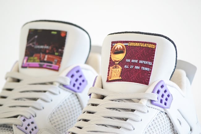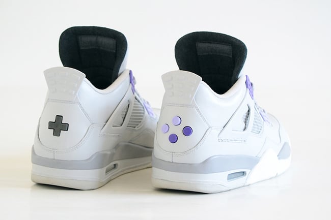 You may remember his previous custom which is the Air Jordan 4 Super Nintendo, but here it comes with a twist. Shades of Grey as well as Purple represent the SNES console while the heel displays a directional pad and buttons. Finishing the look we have NBA Jam โFinals Editionโ which is placed on the tongue tags.