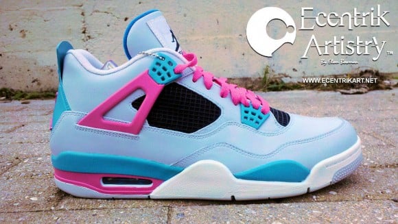 The Air Jordan 4 “South Beach” customs by Ecentrik Artistry sees the popularย blue and pink colorway, with black panels present on the tongues and midfoot. A soft blue covers the entire upper of the shoe, while a stronger tone of blue adds an accentuating touch on the eyelets, heel panels, and top layer of the midsole. A vivid pink adorns the lace strap that sprouts from the heels, and the lower portion of the midsole. The use of pink is continued with the lacing and the Jumpman logo on the back. To help lighten the design, a white outsole serves as base for this design.