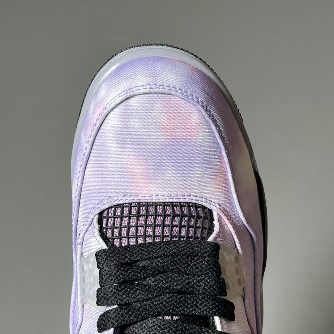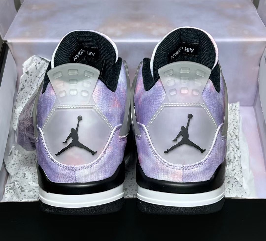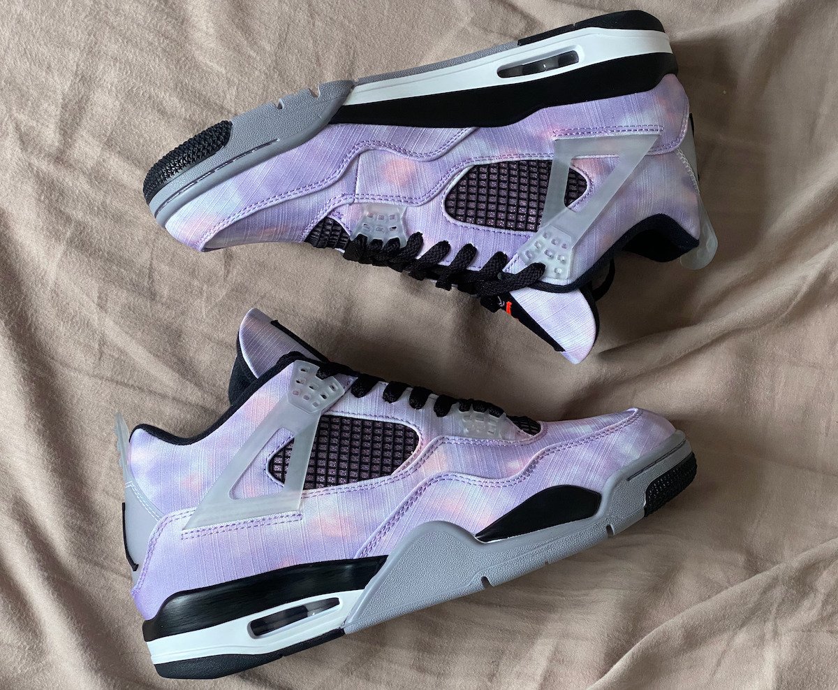 This Air Jordan 4 comes dressed in an Amethyst Wave, Bright Crimson, Black, and Cement Grey color combination. Although images have yet to leak, the mock-up presented resembles the pair. The upper will have a unique graphic that has tie-dye-like vibes. Also, we canโt confirm the material used, and it could be sequin or color shifting.