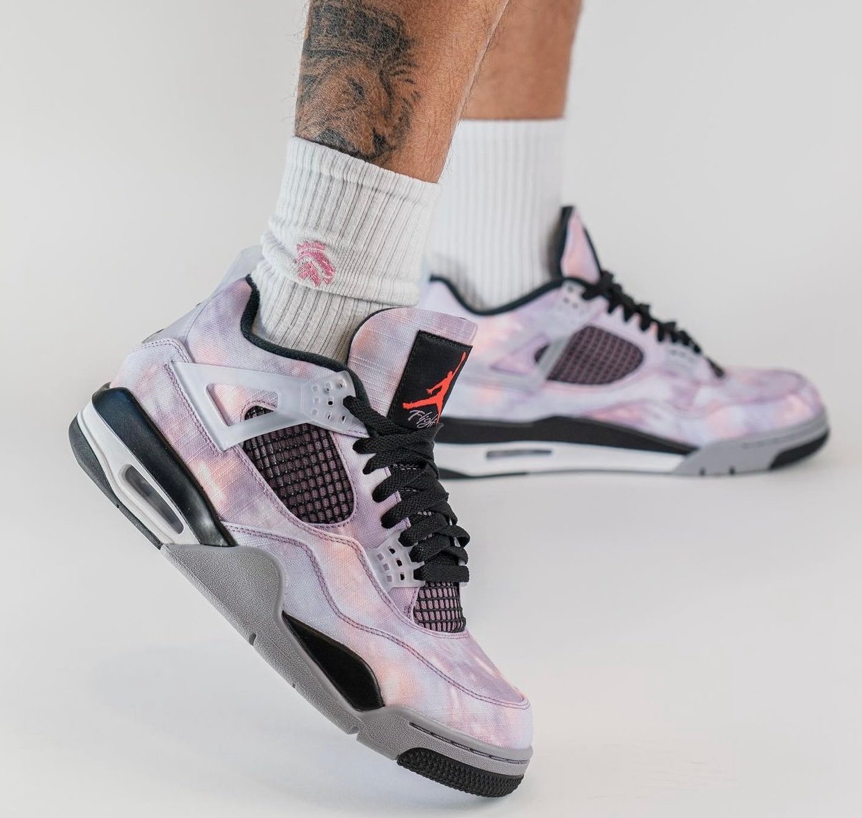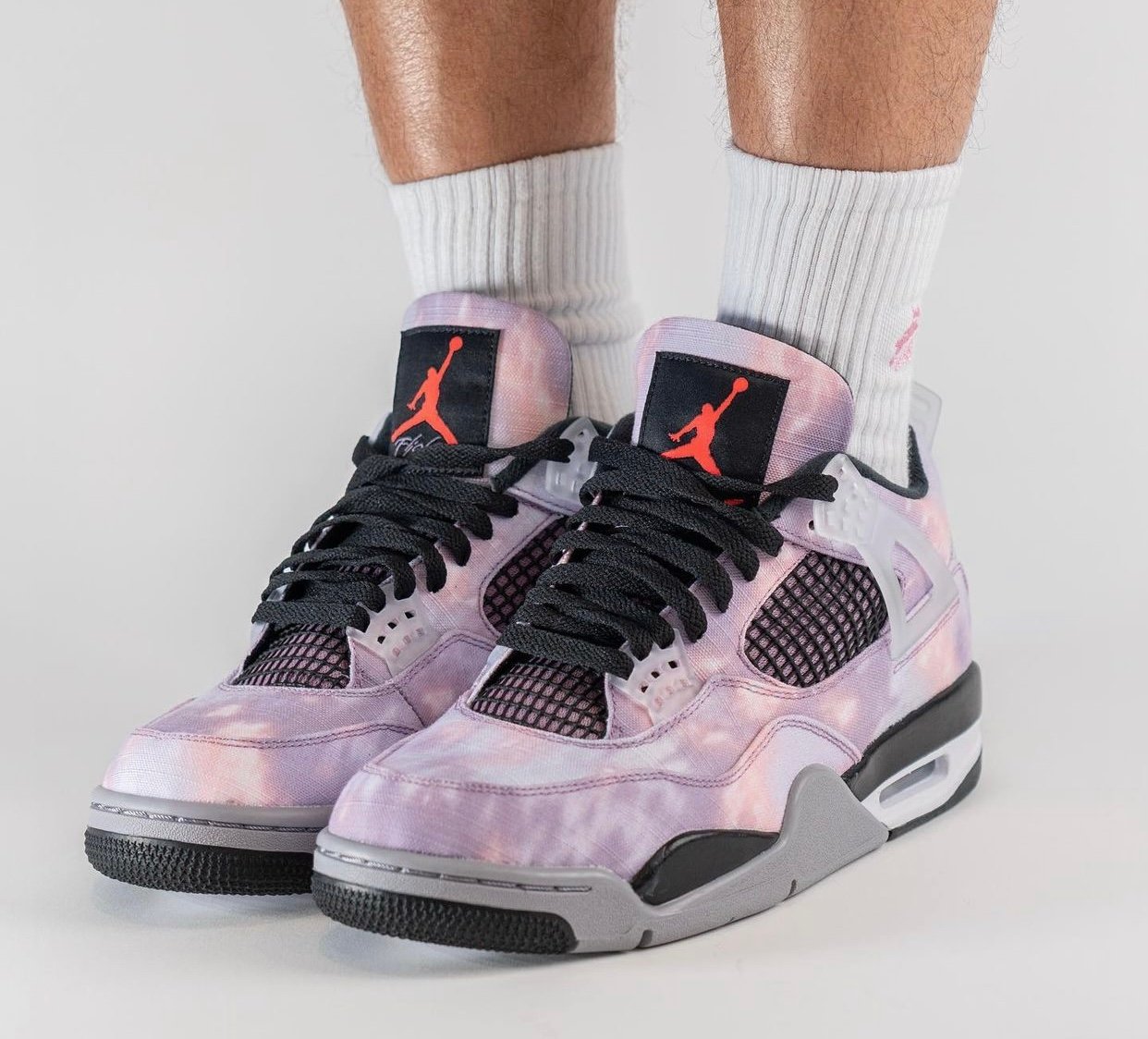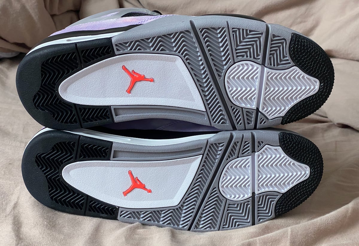 This Air Jordan 4 comes dressed in an Amethyst Wave, Bright Crimson, Black, and Cement Grey color combination. Although images have yet to leak, the mock-up presented resembles the pair. The upper will have a unique graphic that has tie-dye-like vibes. Also, we canโt confirm the material used, and it could be sequin or color shifting.