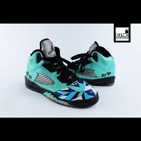 The Air Jordan 5 “Diamond Cut” customs by King of Sneakers arrive in a design dominated by turquoise, with accents of metallic silver throughout. The tongues and netted, midfoot panels carry the majority of the accenting color, but the front end of the shoes are spectacular. KOS created a diamond cut graphic that covers the toes completely. The multiple faces of the diamond graphic are placed in various shades of blue, with spots of white appearing as well. A diamond shaped logo stands next the notorious “23” that is synonymous with the G.O.A.T. Black is another rather dominating color seen with these shoes, as it swallows the lacing and entire midsole, except for the turquoise shark teeth.