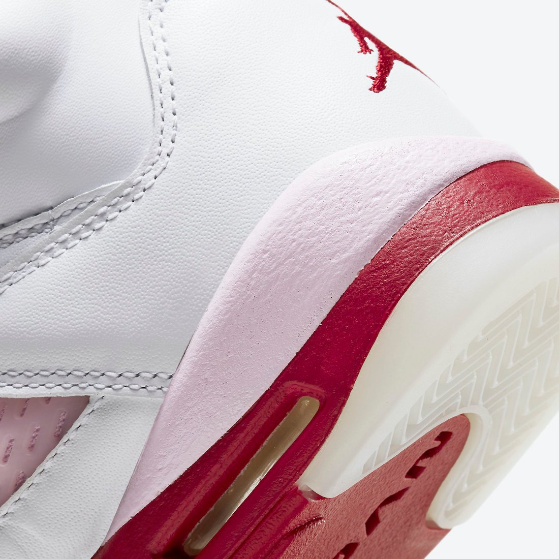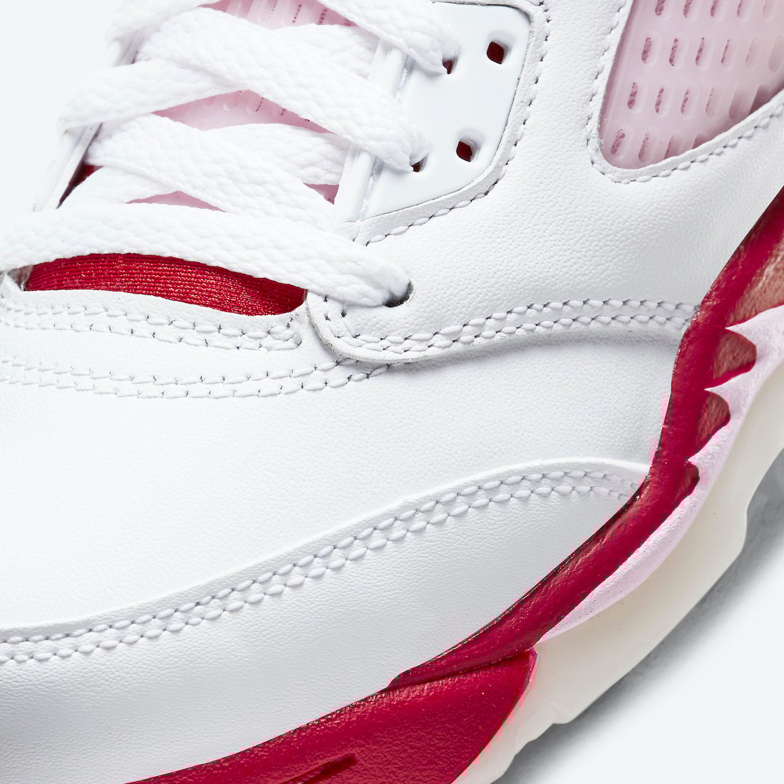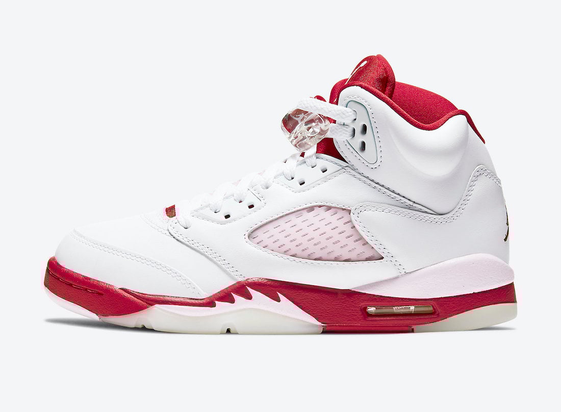 This Air Jordan 5 comes dressed in a White, Pink Foam and Gym Red color combination. Looking closer it features White leather across the upper while Pink Foam is applied to the netting on the panels, tongue and on part of the midsole. Following we have Red on the top of the tongue, liner and most of the midsole while a milky translucent outsole finishes the look.