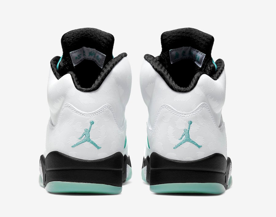 This Air Jordan 5 comes dressed in a White, Black and Island Green color combination. Featuring White leather across the upper with subtle leopard print. In addition we have Island Green on the tongue, netting, eyelets and translucent rubber outsole. Black then lands on the laces, branding and midsole while Metallic Silver accents complete the look.