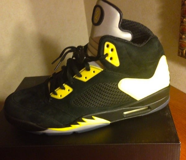 The Oregon Ducks have been sitting extremely pretty when it comes to world of PEs. While they already have a litany of team-inspired heat under their belt, it looks like they have just added another dope pair of kicks to their resume. Posted below is your very first look at the “JumpDucks” Air Jordan V. As you will see, these kicks sport a dark suede upper with some extra touches of yellow about the accents with a splash of green about the laces. But the most striking feature on these kicks is the Jumpman logo that has been converted into the Ducks mascot doing the Jumpman pose. Read on after the jump to check out another look and be sure to drop us a line in the comments section below.