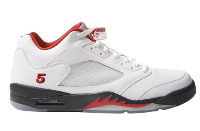 There was however a player exclusive made for Jordan team member Derek Anderson. For now we have used DA’s PE as a placeholder, since the actual release will look identical except for his number 5 stitched on the side. The Fire Red Air Jordan 5 Low will feature white leather through the uppers along with transparent netting, fire red accents along the flames, liner and inside of the tongue. Black will take over the midsole while 3M reflective material hits the tongue.