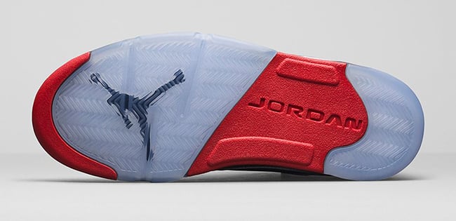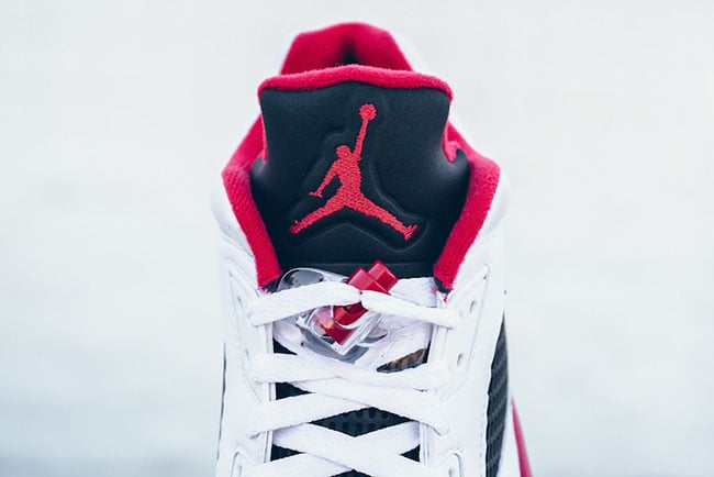 Now that we have seen the Fire Red Jordan 5 Low for 2016, there are differences between the general released pair and PE. As you can see, fire red will land on the midsole, liner and Jumpman placed on the tongue. Following is black placed on the flames and mesh netting, something we have yet to see before. Other details include a white base and translucent blue tinted outsole.