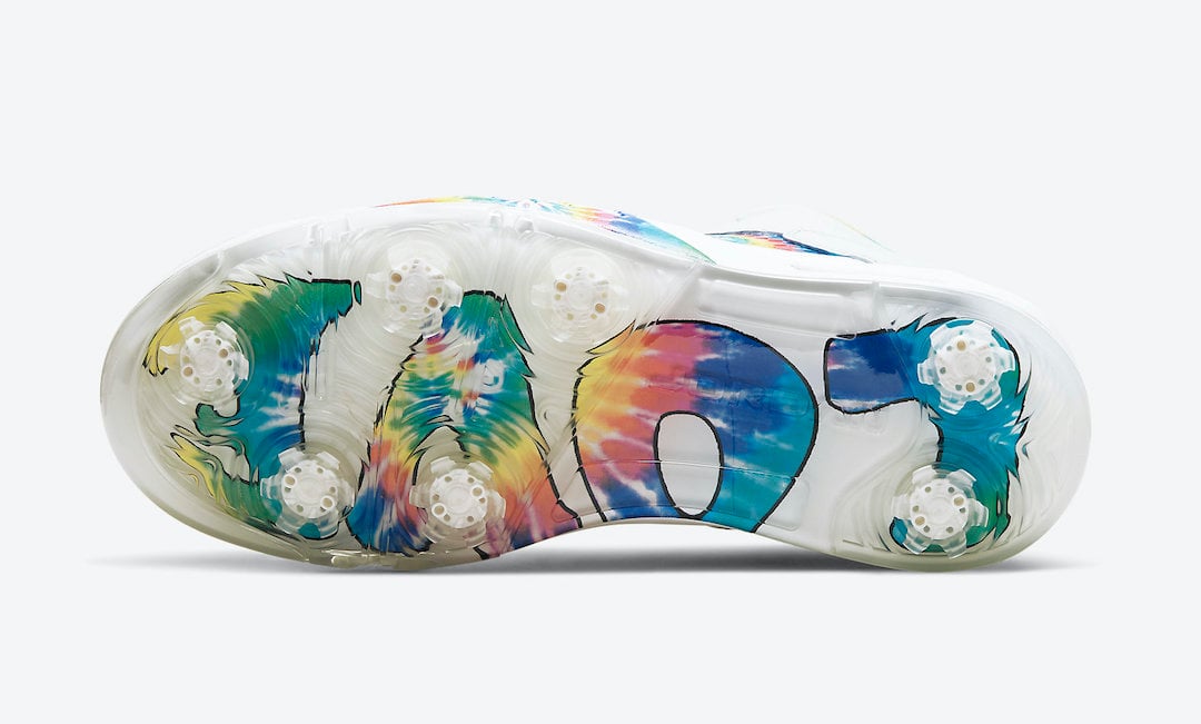 Looking closer this Air Jordan 5 Low features White leather across the upper while tie-dye print lands on the liner, shark teeth and netting. In addition we have a clear translucent outsole which showcases โPEACEโ and โLOVEโ. Following we have Silver on the Jumpman logos along with removable spikes to finish the look.