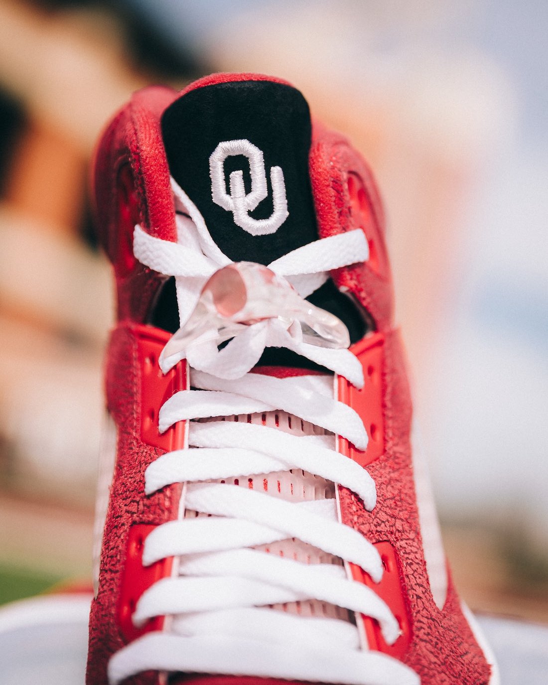 Looking closer, this Air Jordan 5 for the Sooners features Red across the entire upper while elephant print runs throughout. Next, Black suede adorns the tongue while the Sooners โOUโ logos are embroidered in White. Following, speckled accents land on the shark teeth overlays while White hits the midsole, and we have an icy translucent outsole. Finally, Nike Air embroidered on the heels completes the look.