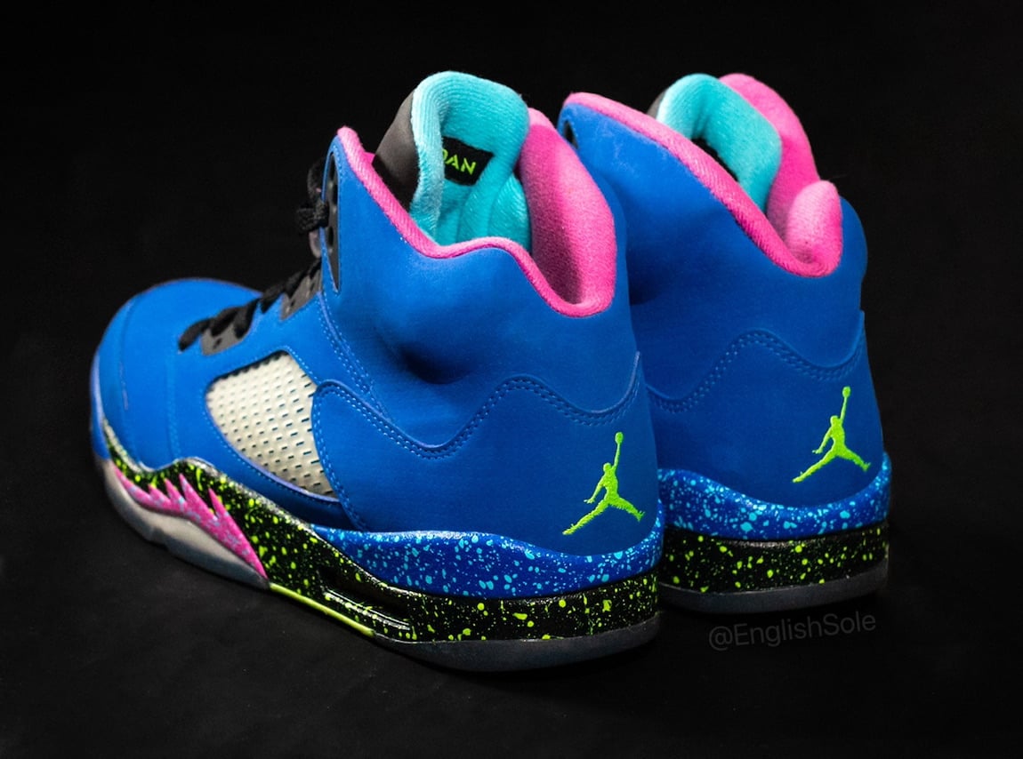 It looks like Jordan Brand had different ideas for this Air Jordan 5 because today we have a look at the โReverse Bel-Airโ Sample. Featuring Blue on the upper, which replaces the Cool Grey. Speckled detailing lands on the tongue and midsole, while Pink is applied to the liner. Volt is also used on the shark teeth and hints on the translucent outsole.